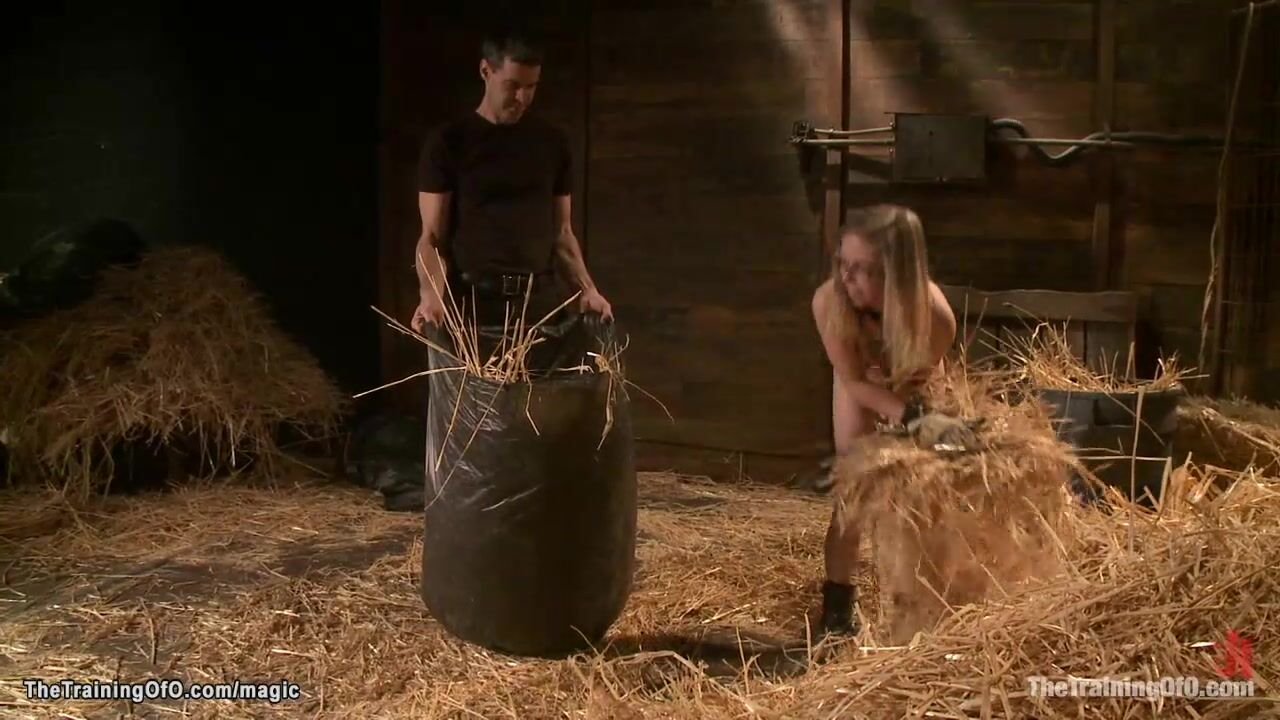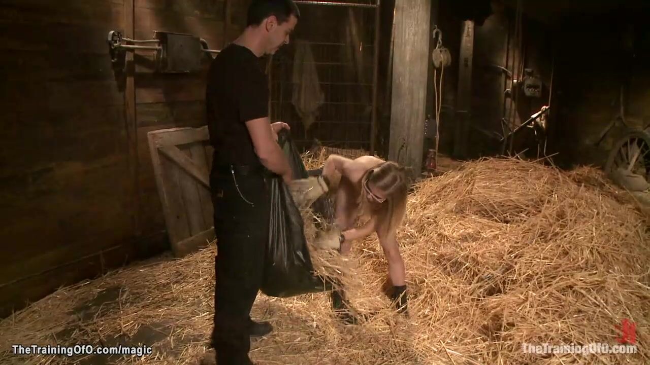 Busty blonde slave Penny Pax is bound in back arch position and whipped by master James Mogul then made suck huge dick to gimp Owen Gray and take it in the ass