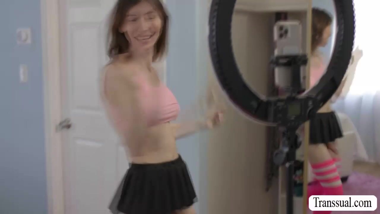 Slut shemale Korra Del Rio is getting naked while recording it.After that,she hears someone having sex upstairs.She saw her stepsister and her boyfriend on the bed.She lets her stepsister out and she throat and ride bald guys big cock.