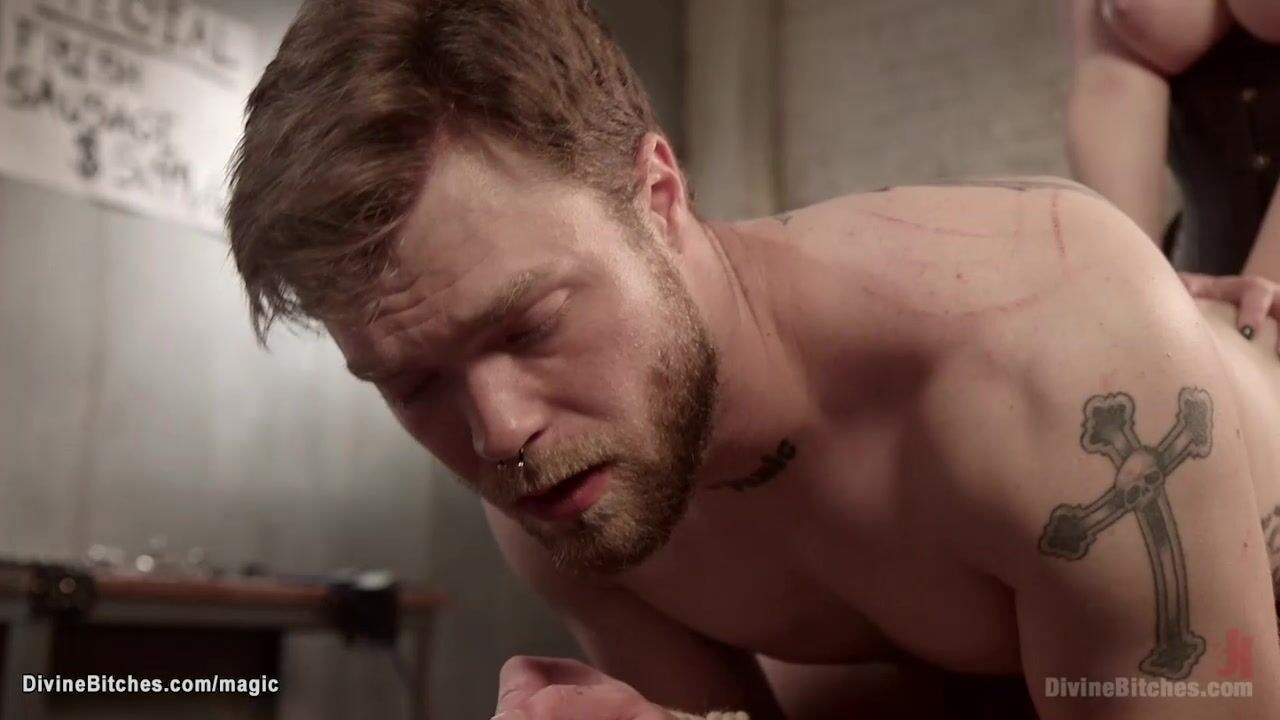 Big tits blonde MILF butcher Aiden Starr straps down on knees delivery man Mike Panic and clamps his nipples then in doggy position anal fucks him with strap on cock