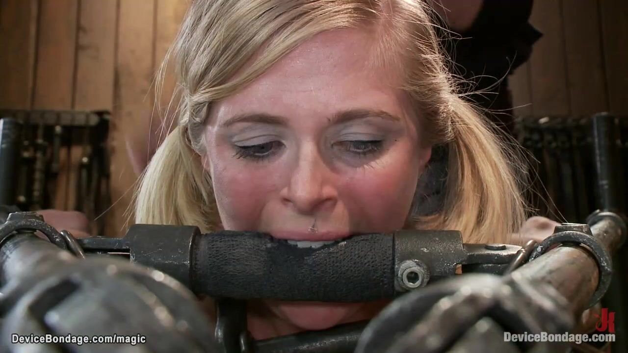 Big tits blonde lesbian slave Penny Pax is strapped to different metal devices fingered and vibrated then anal fucked with dildo on a stick by lezdom Claire Adams