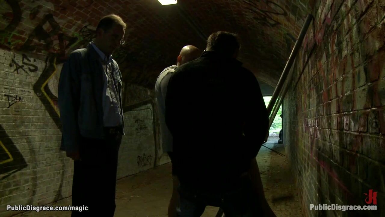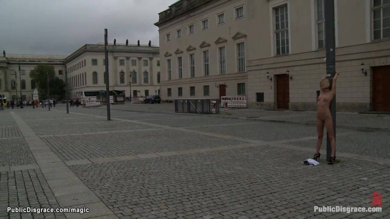 Blonde babe Paris Pink is bound and gagged in public square then in various places outdoors gang banged and mouth fucked by big cocks