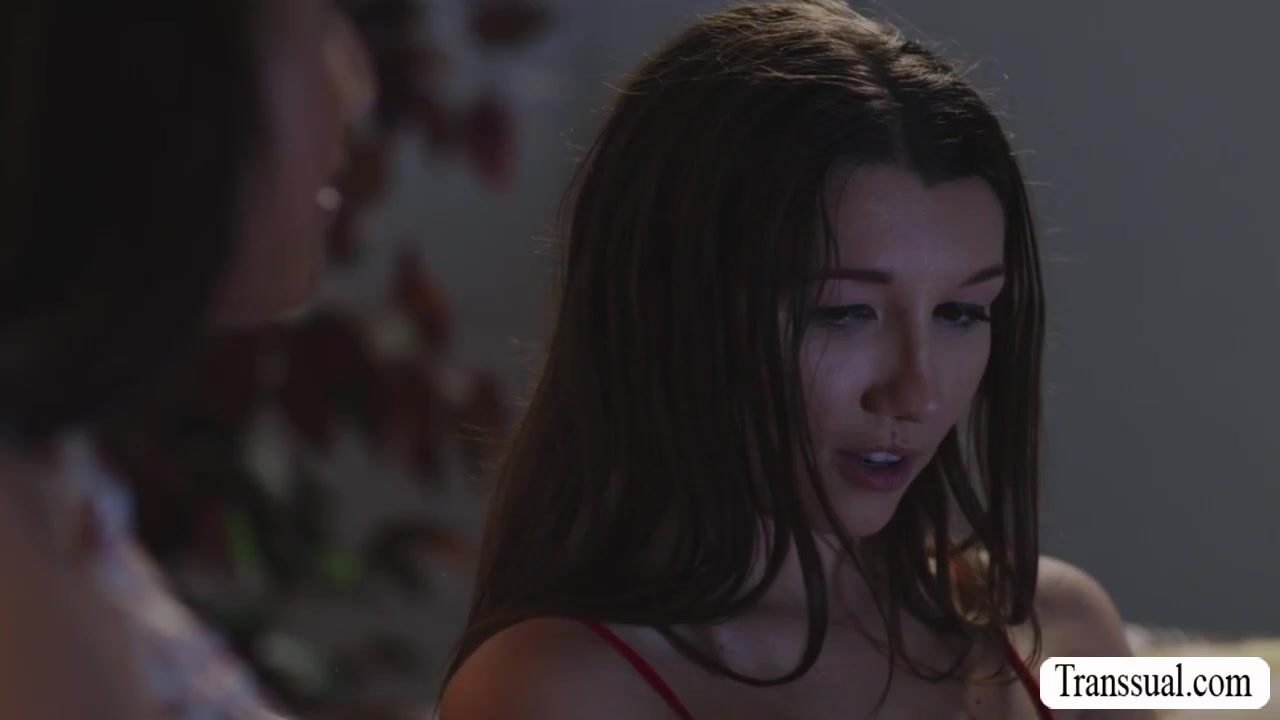 Busty shemale joins her hot stepdaughter watching movies.After that,they get horny and start kissing each other.Next is,she lets her stepdaughter suck her tranny hard cock passionately.In return,she licks and bangs her tight pussy so deep and hard.