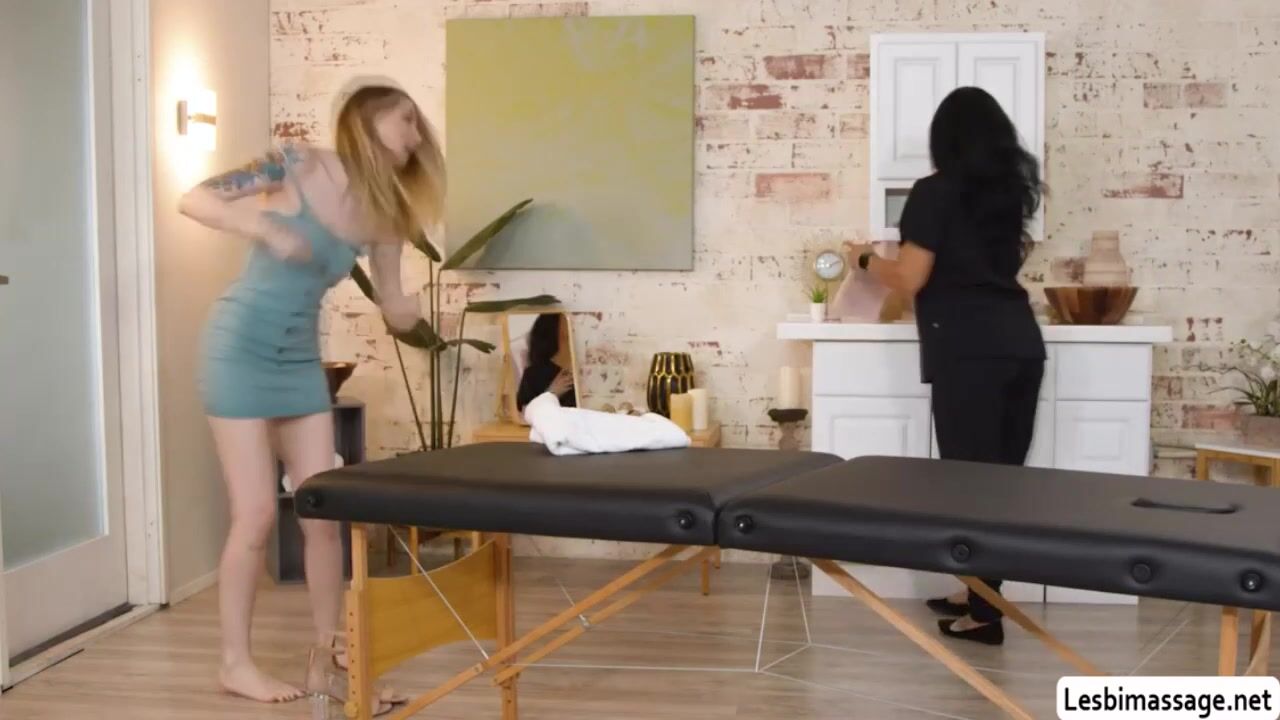 Mature masseuse lets her wet client from the rain get naked and gives her a hot massage.After that,while massaging she gets horny and start licking the pussy of her client.Next is,her client gets horny too and they lick their pussies in 69.
