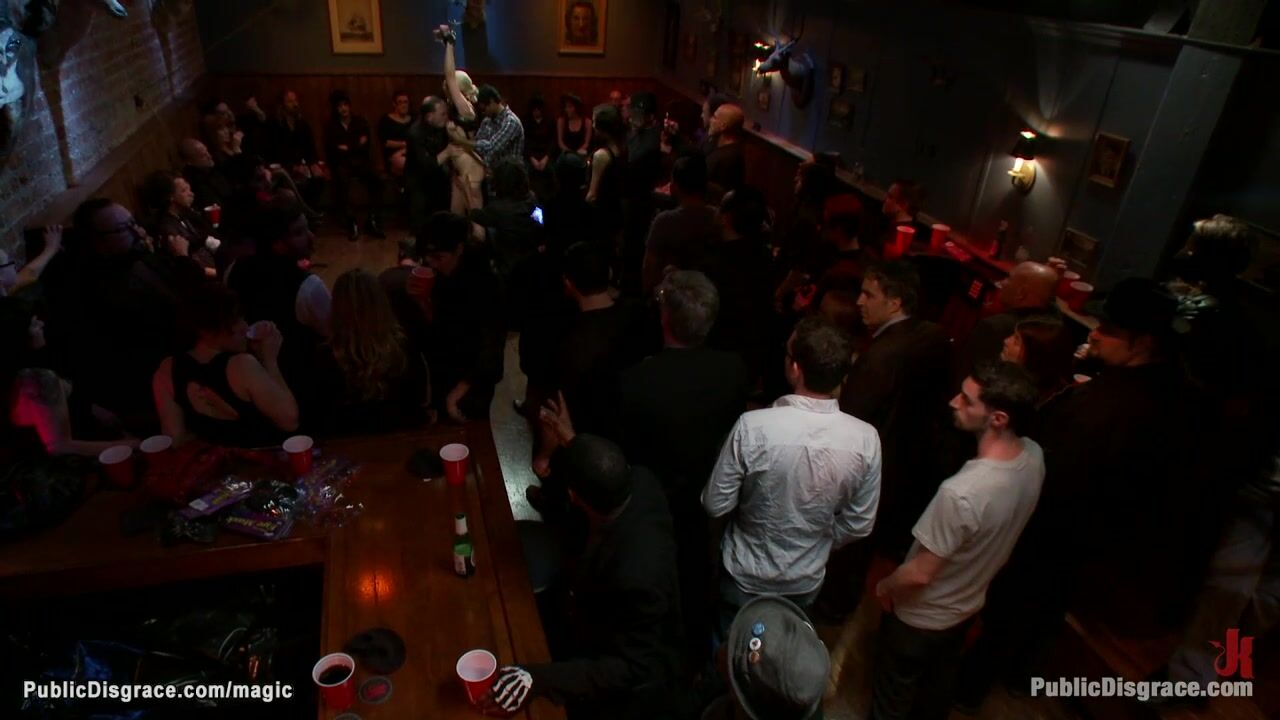 Hot ass blonde slave Natasha Lyn gets cattle prodded by mistress Princess Donna Dolore then big cock gang bang fucked in crowded public bar
