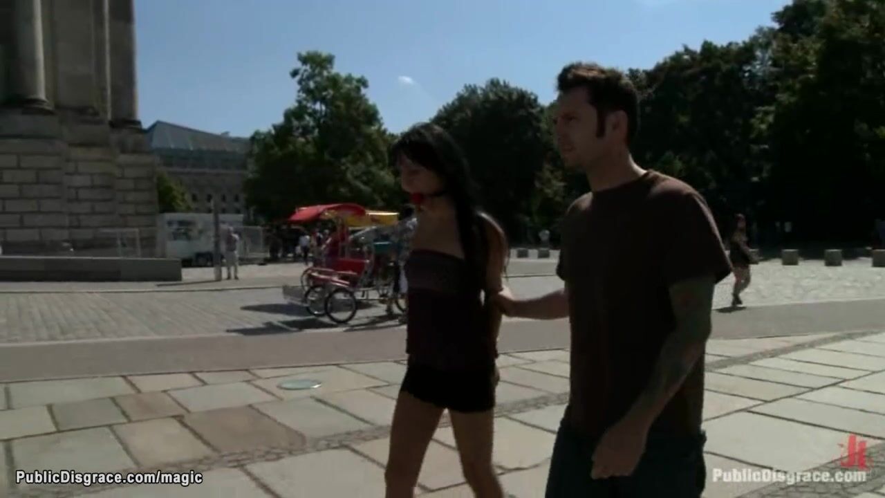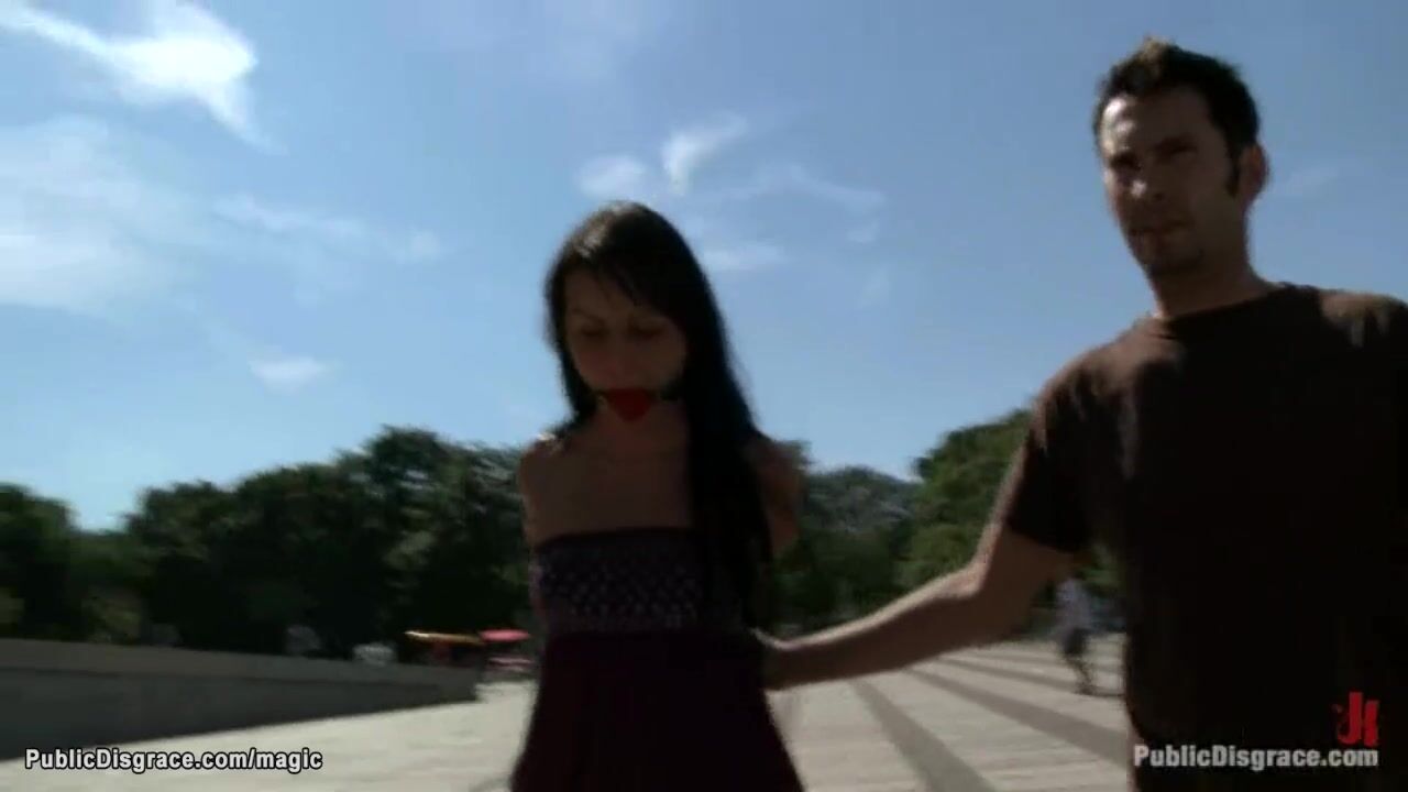 European hottie Felicia D is gagged and hands bound behind back with bare tits and walked in very busy public place then fucked in quiet place by big cock master Tommy Pistol