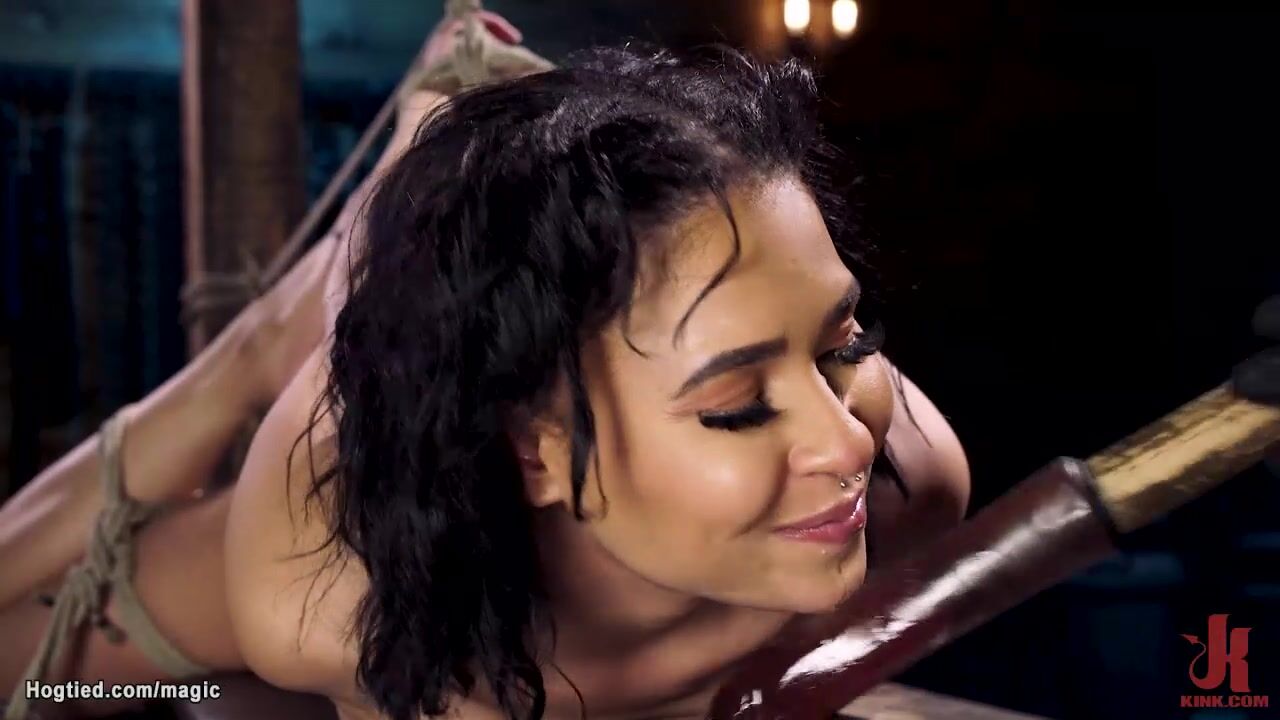 Small tits brunette slave Ryder Rey is bound in standing position with spreaded legs and pussy vibed then hogtied and throat fucked with dildo by master The Pope