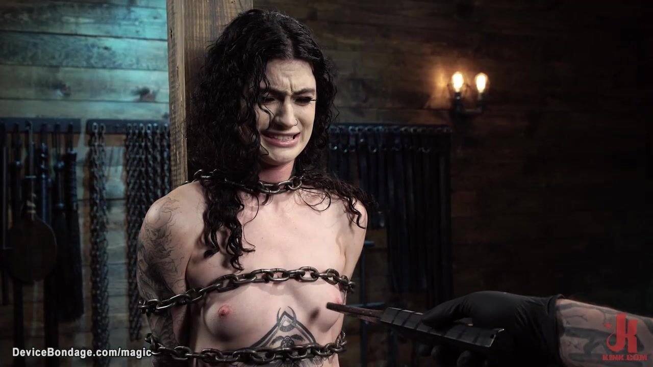 Petite tattooed brunette slave Lydia Black is chaind to wooden post in standing position and tazappered then tormented in extreme restrictions by master The Pope