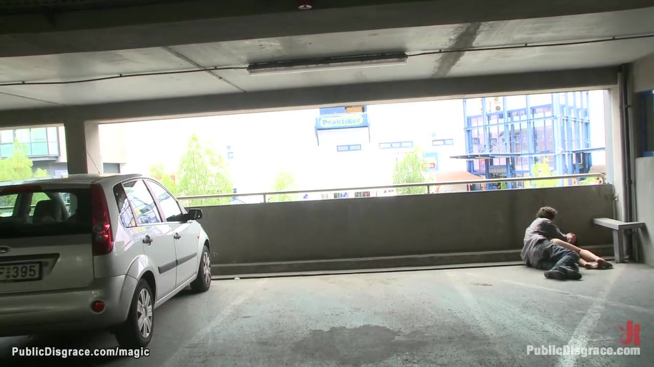 Bound wrists behind back bare foot Euro brunette babe Lucy Bell walked through public streets then dirty slut big cock fucked in garage by master Steve Holmes