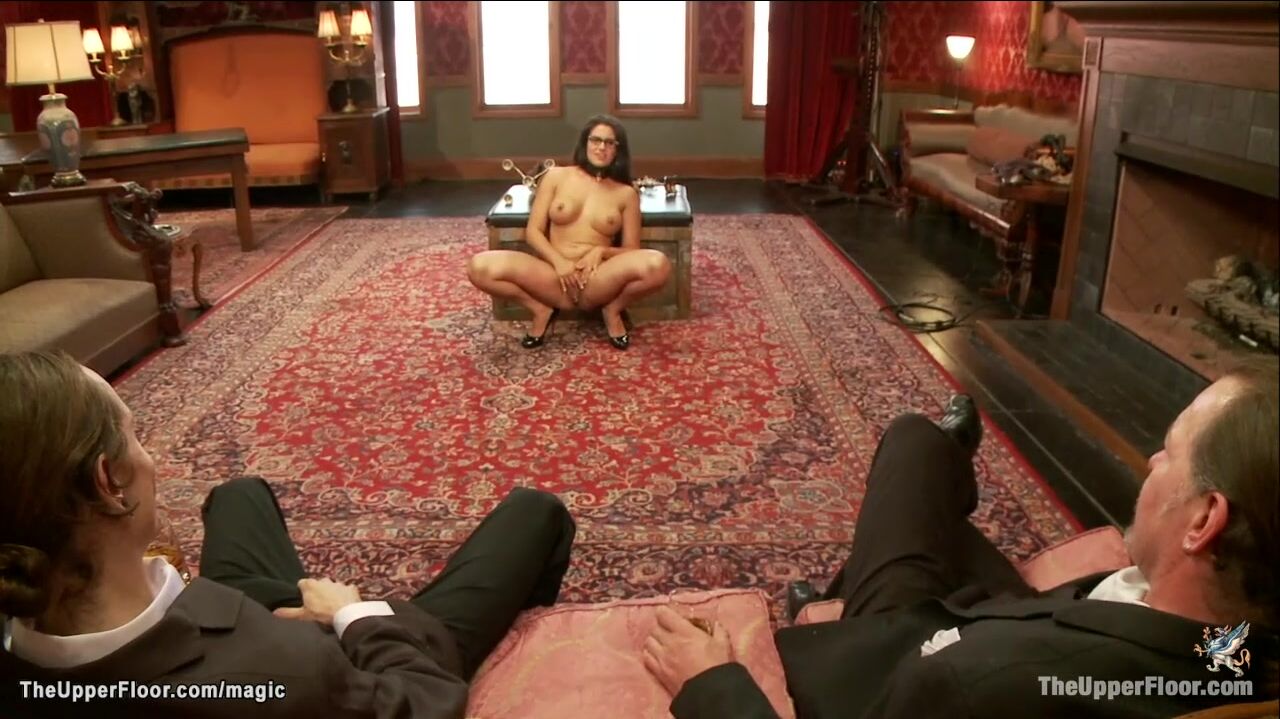 Big tits brunette MILF slave Penny Barber fingers pussy in squating position with open legs for James Mogul and Owen Gray then gets anal fucked in the Upper Floor