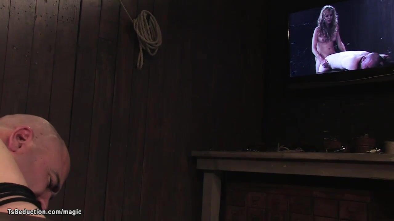 Big tits blonde dom mature shemale in red latex dress Johanna B whipping bound baldheaded man slave Tyler then anal fucking him with big cock