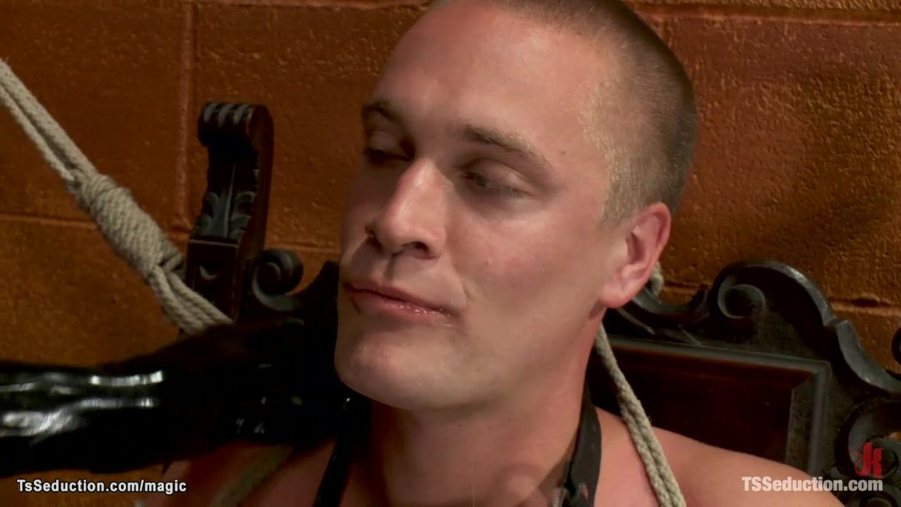 Huge tits and huge dick Asian brunette shemale dom Yasmine Lee in kinky latex lingerie dominates and fucks bound man slave Rocky in various positions