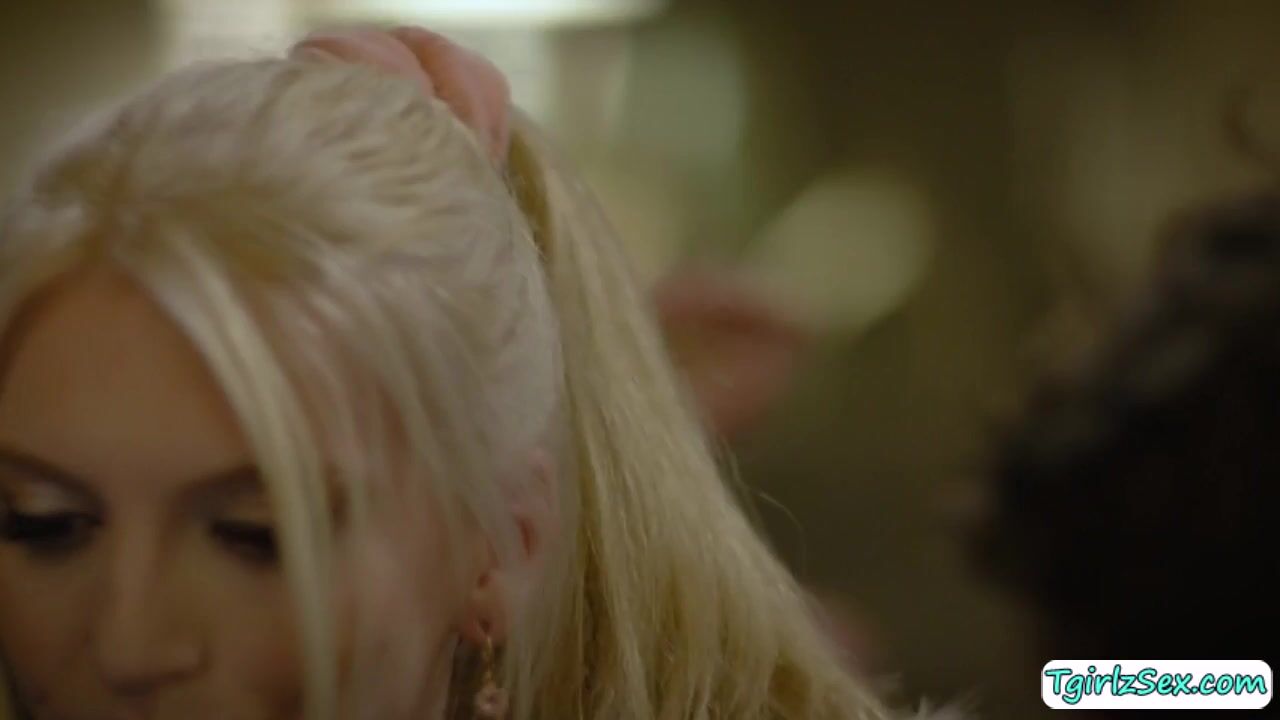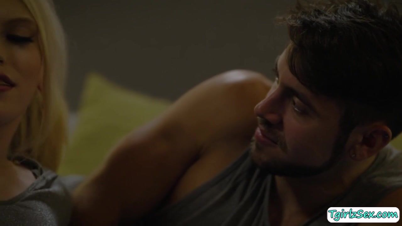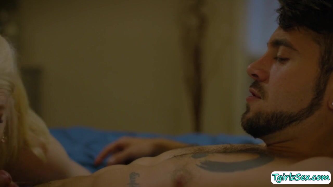 In the bedroom, pretty small tits transexual babe Izzy Wilde flirts with handsome straight guy kissing while caressing his big cock then bows down to deepthroat blowjob it. The blonde tranny stretches big asshole to take huge dick to hardcore anal bareback.