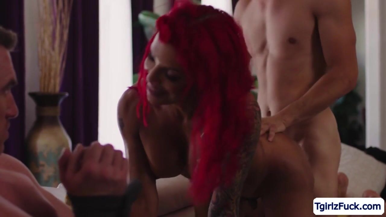 One afternoon, big tits latina transexual Foxxy ties her husband ont he couch while she flirts with another straight guy and trade deepthroat blowjob while he watches over. The busty brunette tranny bends over near him to take his big cock up her tight asshole.