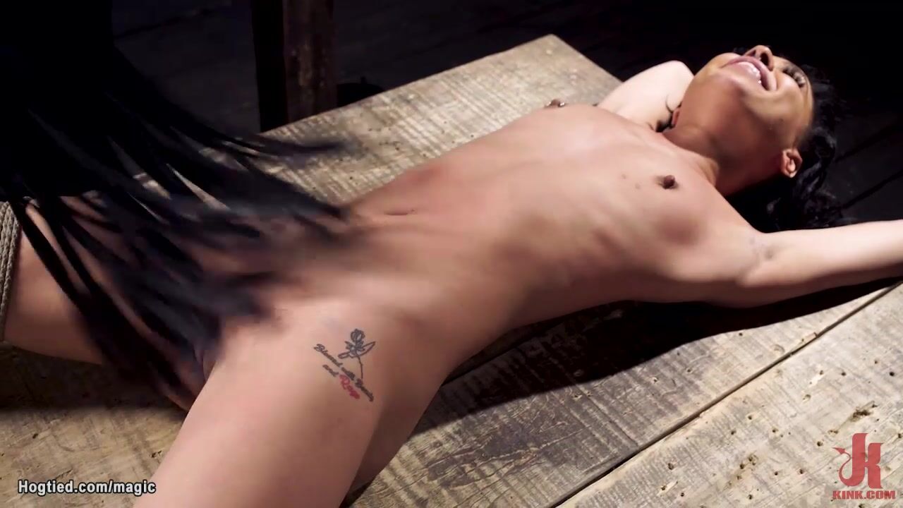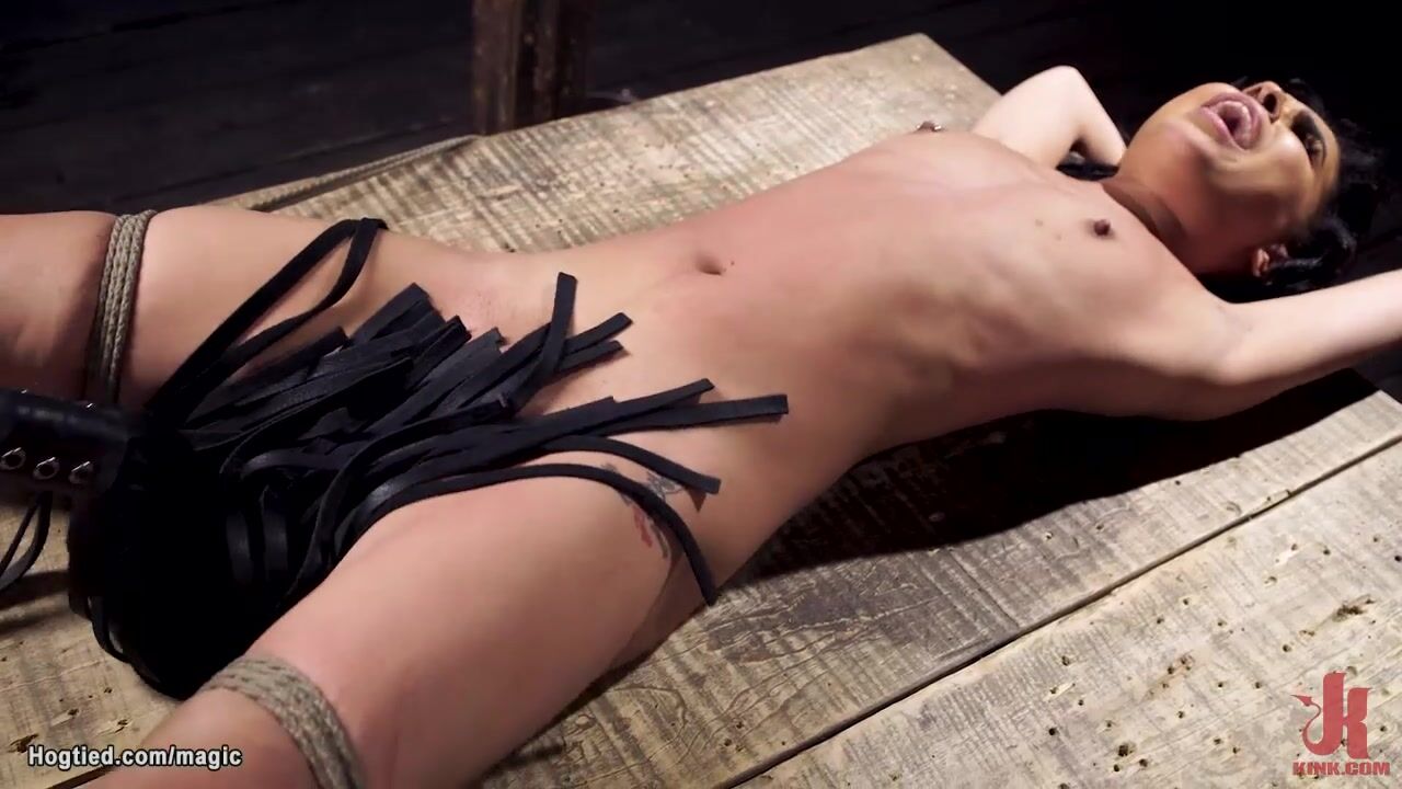 Masked master The Pope in latex gloves vibrates pussy to little bound slave Ryder Rey then in hogtie position fucks her with dick on a stick