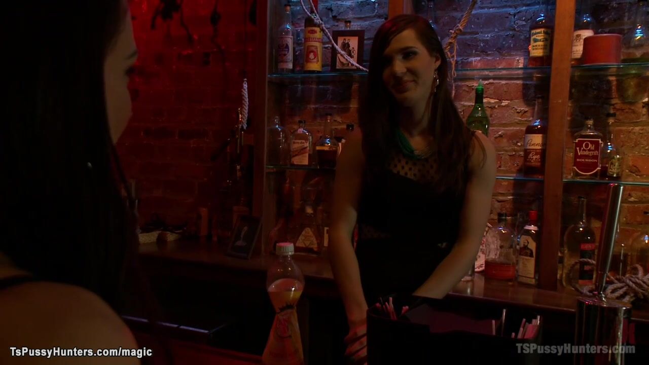 Hot brunette shemale bartender Stefani Special sneaks hot brunette babe Mandy Muse into uncles bar and then with big cock fucks her in pussy and ass