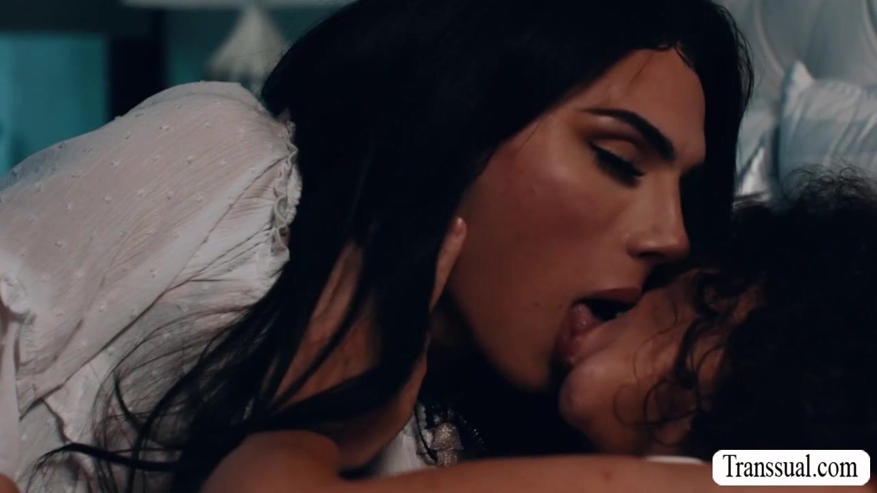 Teen babe and her TS stepmommy are on the bed kissing each other while cuddling.After that,she lets her TS stepmom lick her pussy first to makes it wet.In return,she throats her tranny cock and she then rides it passionately.