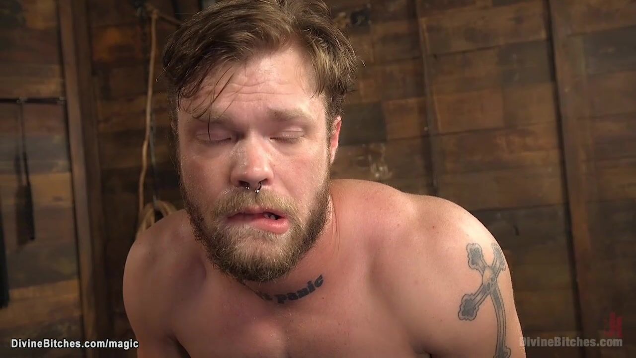 Tattooed man slave Mike Panic is bent over wooden pony and ass paddled by femdom in latex Joey Minx then ass finger fucked and balls tormented in her dungeon