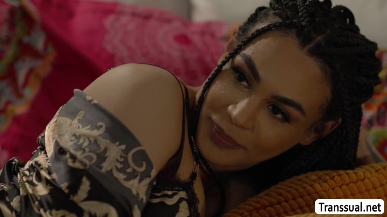 Tattooed shemale is on the bed while her busty stepsister talks to her.After that,they start kissing each other and she lets her stepsister suck her hard tranny cock.In return,she licks her pussy first to makes it wet and fucks it so hard.