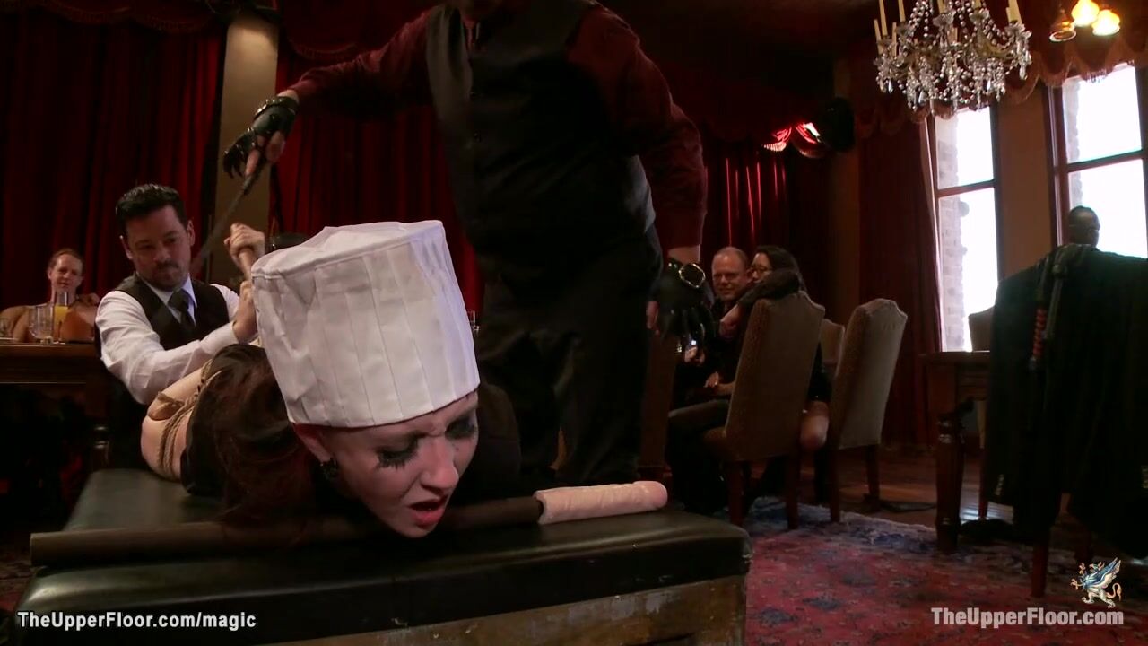 Bruch red head chef Nerine Mechanique is rewarded by host of party and fucked with dick on a stick in bondage while Alani Pi and Beretta James fucked by horny guests in the Upper Floor