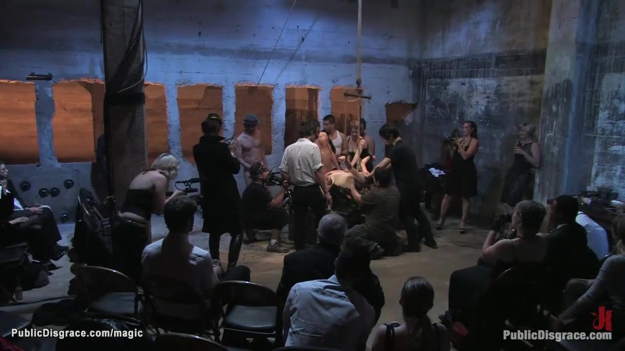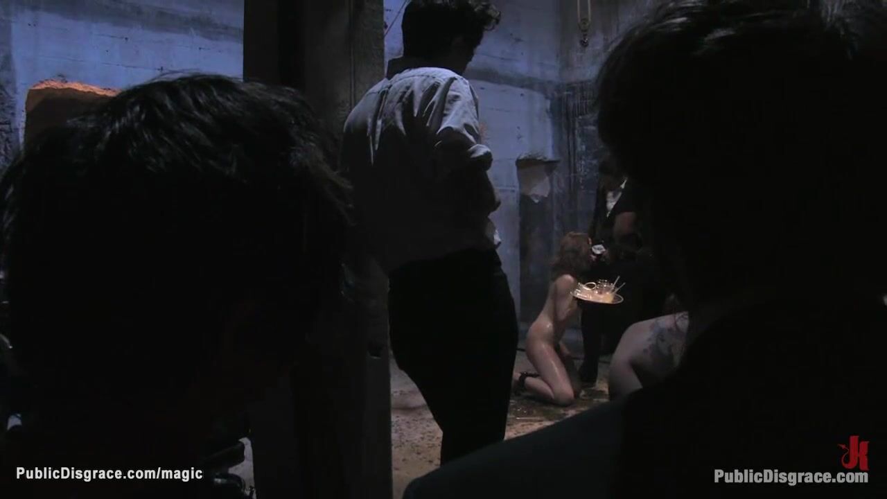 New brunette slut Sarah Shevon is bound by dom Princess Donna Dolore and anal fisted and fucked then collects cum in metal plate in public from big cock strangers