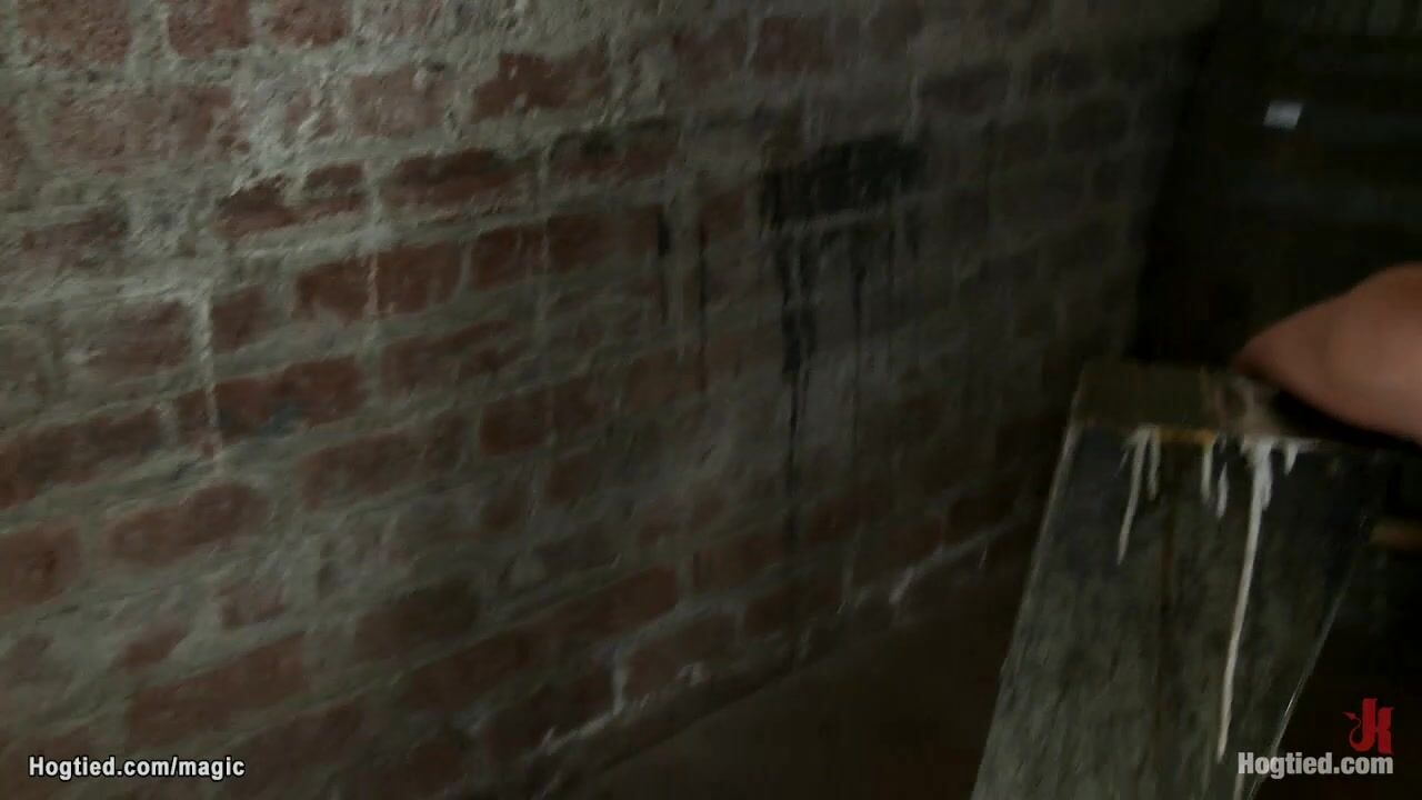 Huge tits blonde slave Holly Hearts is bound down on her knees and whole body oiled then nipples sucked and throatfucked with big cock in threesome domination on hogtied