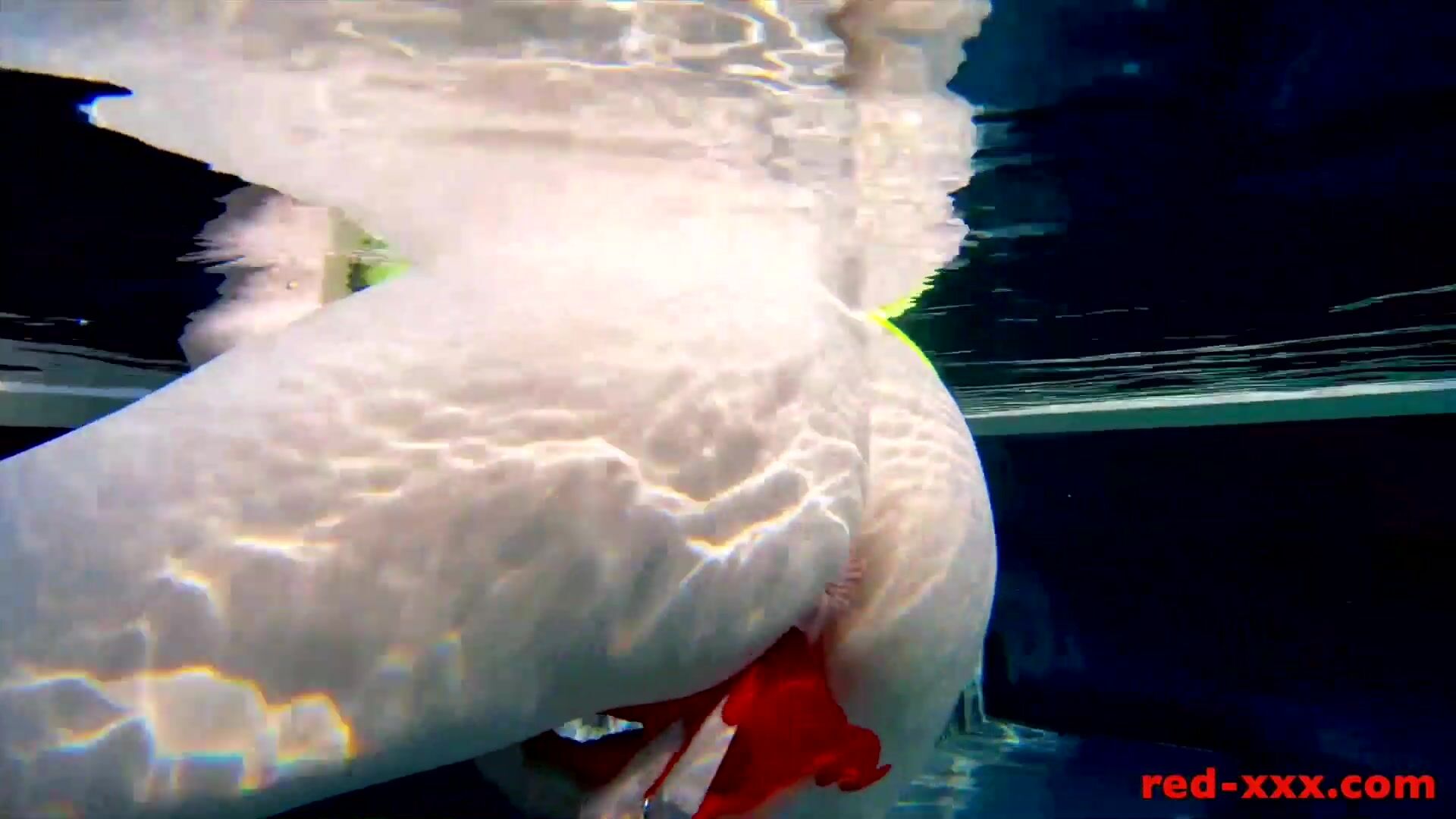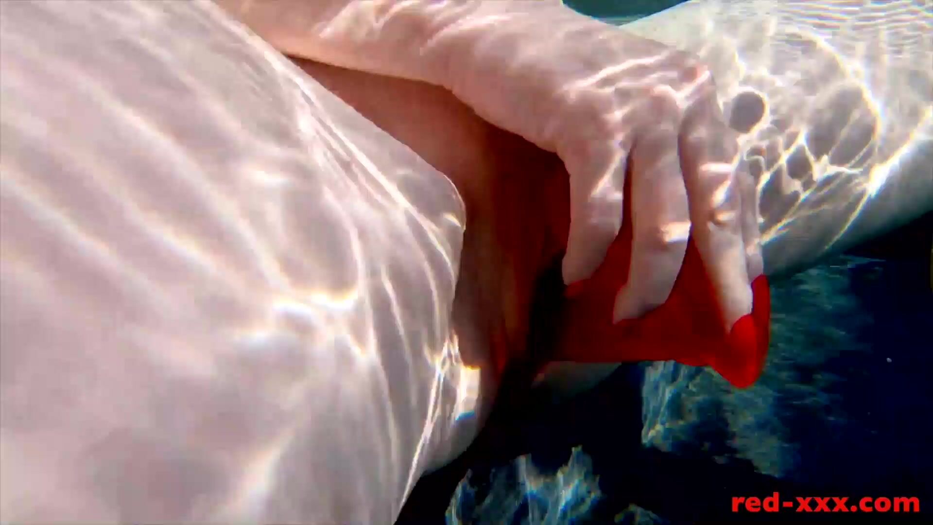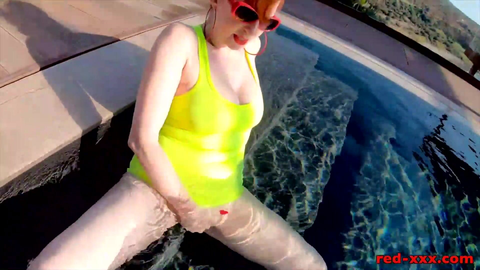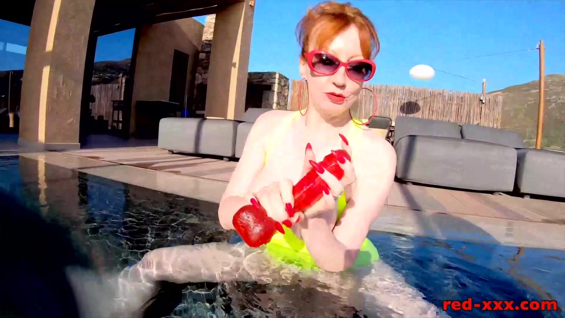 Red XXX fucks her pussy with a toy in the pool