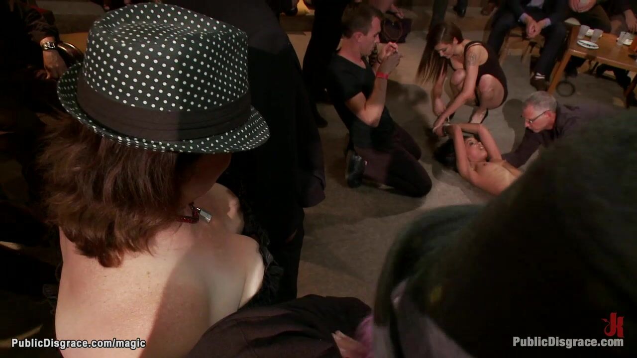 Princess Donna Dolore straps hot brunette slave Skin Diamond in crowded public place then big cock James Deen fucks her with big cock strangers in group action