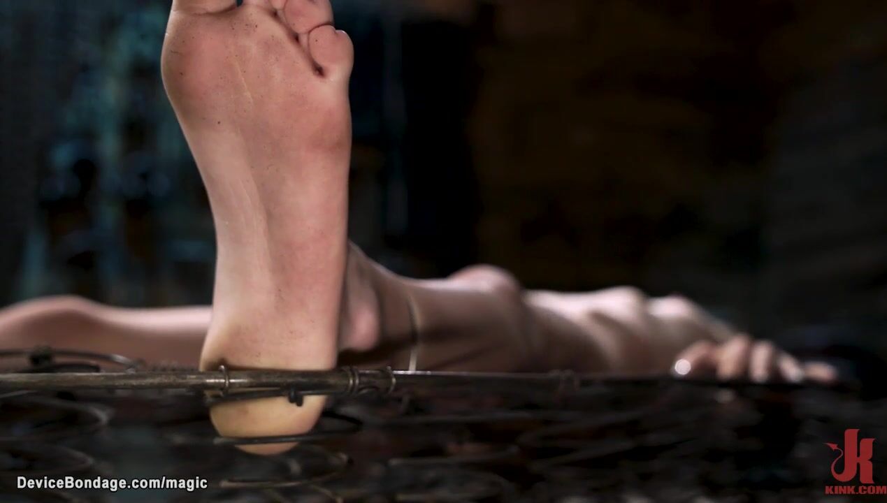 Skinny brunette slave Brooke Johnson is mounted on wooden pony with all weight on her pussy then gets whipped till strapped to mattress coil and vibrated by master The Pope on device bondage