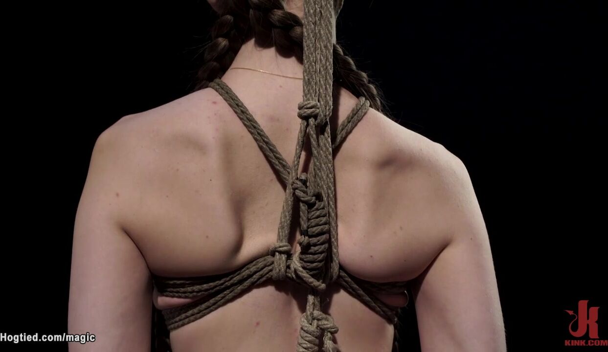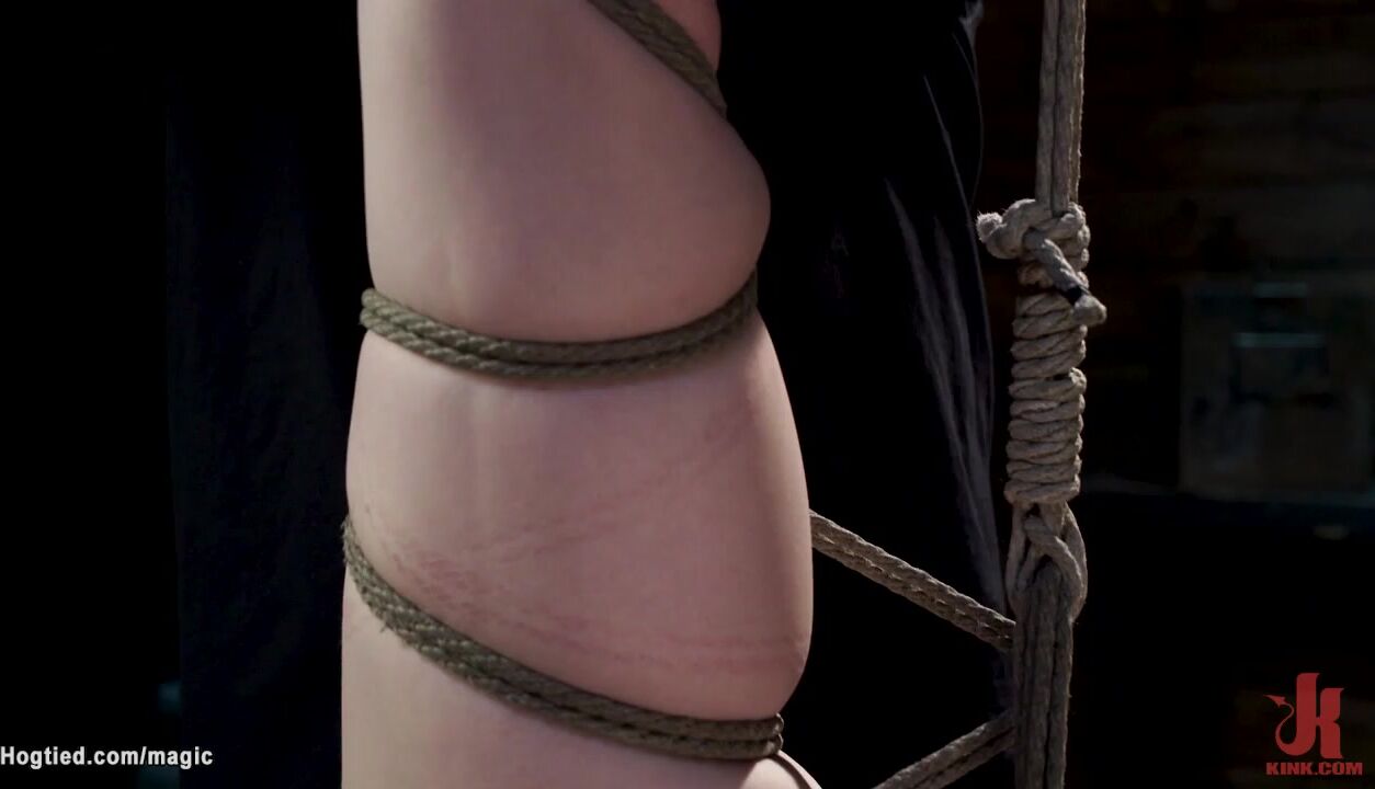 Brunette hot slave Erin Everheart is bound in standing position then leg pulled in stress position till in side suspension pussy vibrated by master The Pope on hogtied