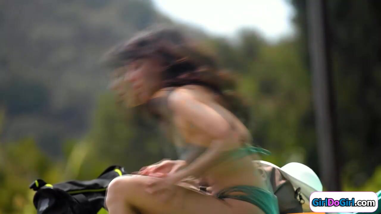 Blonde got divorced due to her coming out but does not have lesbian experience.The small tits brunette is teach her and they start kissing.The babes spreads outdoors on the side of the pool and gets her shaved pussy licked.She gives her first oral