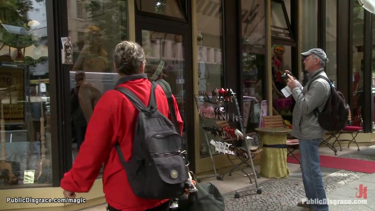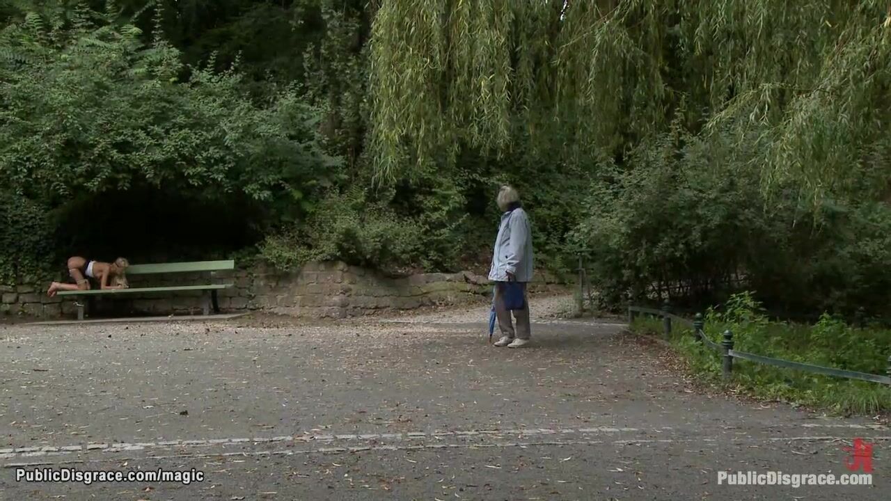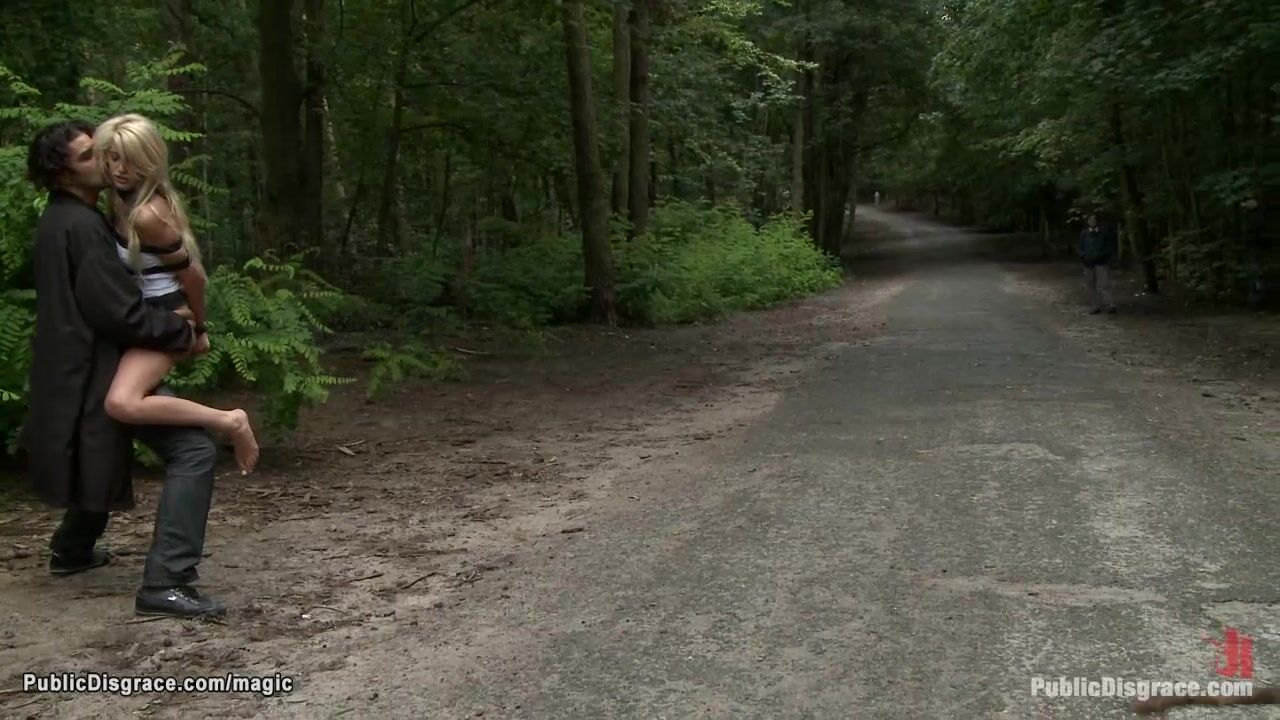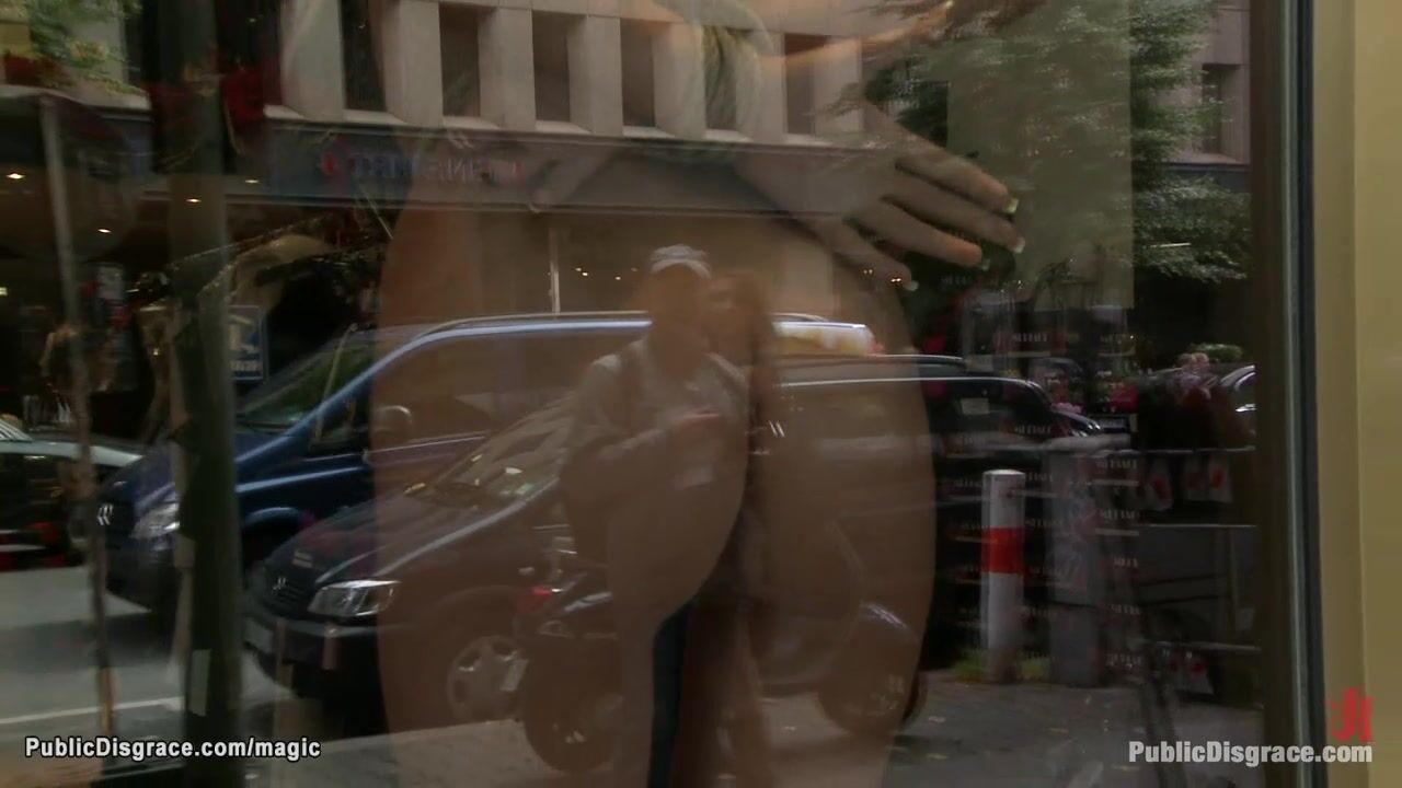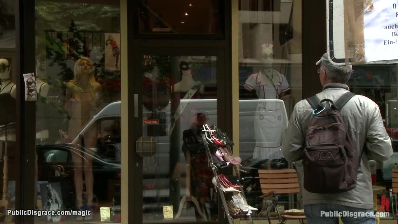 Naked bound blonde Euro babe Blanche Summer posing in public store window then blindfolded and bound left on the bench with ass exposed in the park till fucked in woods by big cock Zenza Raggi