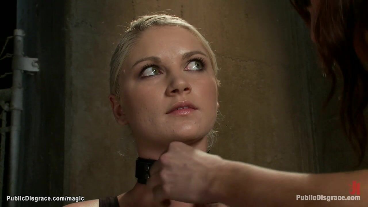 Dom Princess Donna Dolore put on black lenses in eyes of blonde slave Natasha Lyn then drags her in public bar for gang bang fuck with big cock strangers