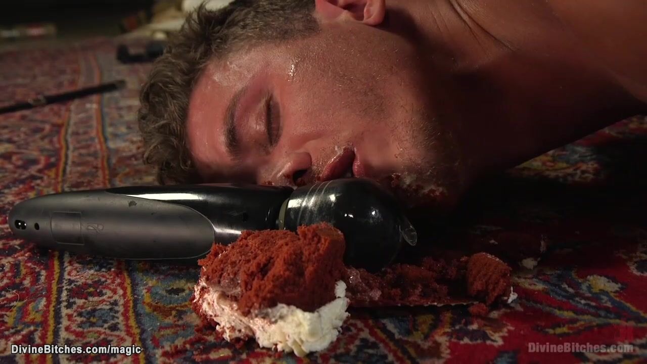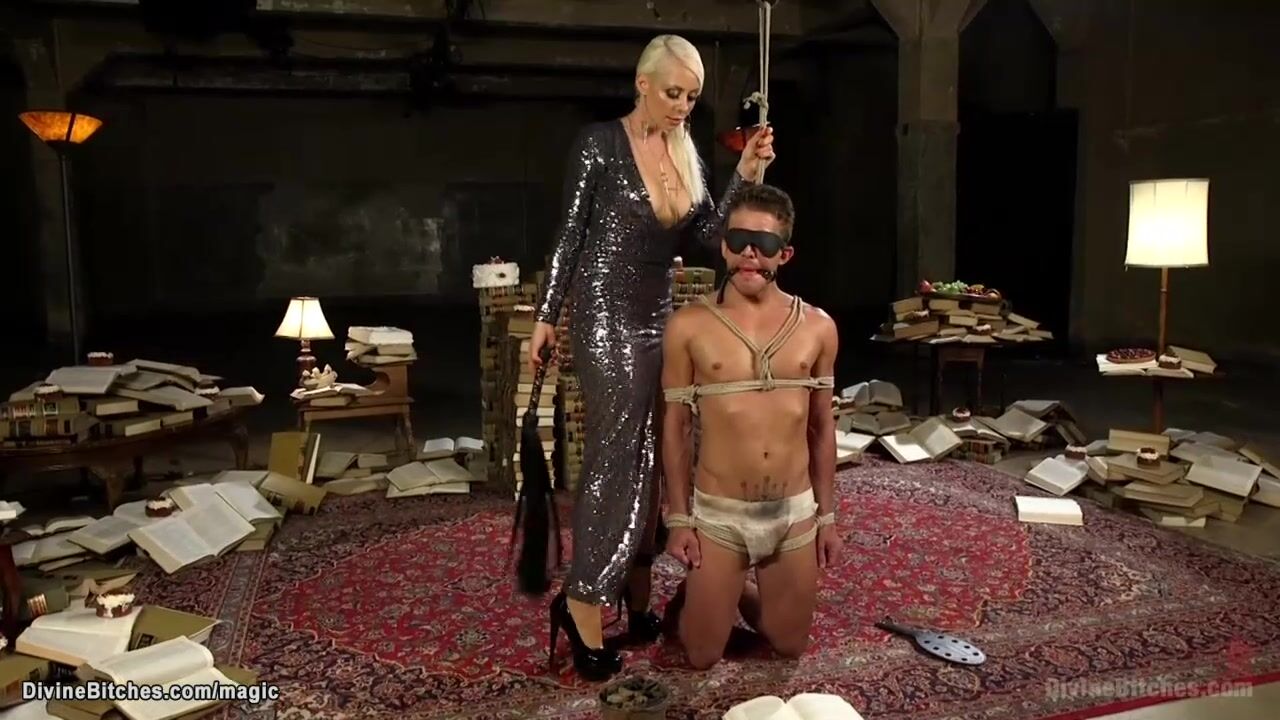 Glamorous blonde femdom in glitery night dress and tights Lorelei Lee binds Alexander Gustavo down on his knees and feeds him with cake then whips and anal fucks