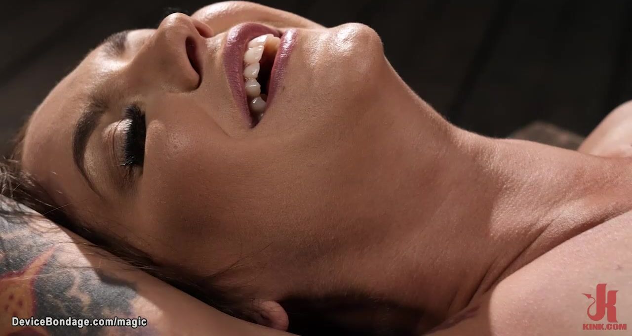 Huge tits tattooed slave Rocky Emerson is bound in metal device with legs open then shaved pussy fucked with dick on a stick by master The Pope in dark dungeon