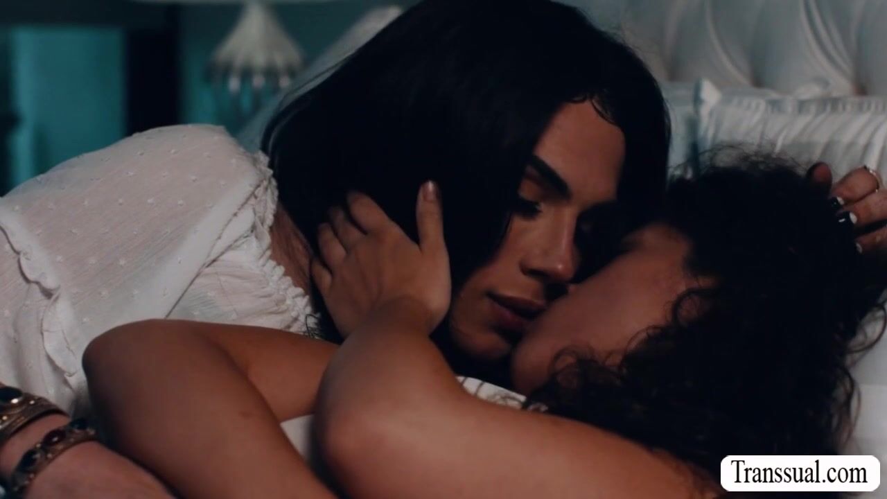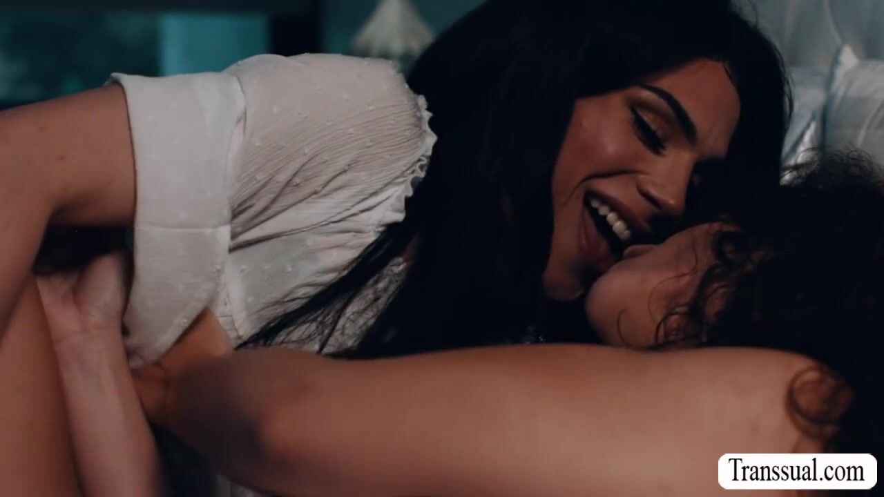Curly teen and her TS stepmom are on the bed cuddling to each other.After that,they get horny and start kissing each other.Next is,she lets her TS stepmom lick her tight pussy to makes it wet.In return,she throats her TS stepmoms shecock and rides it.