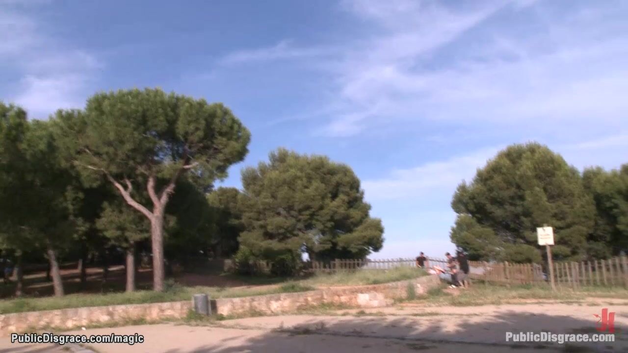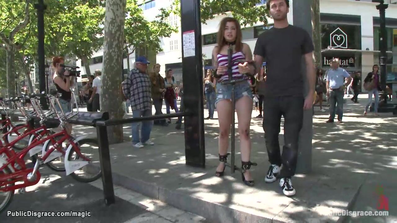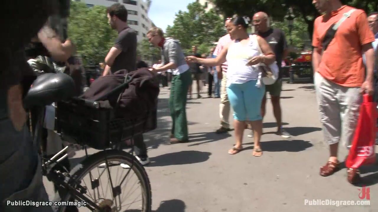 Bare boobs young European babe Dulce Mariposa is walked bound through crowded streets in the middle of the day then fucked in the park by big cock James Deen and stranger