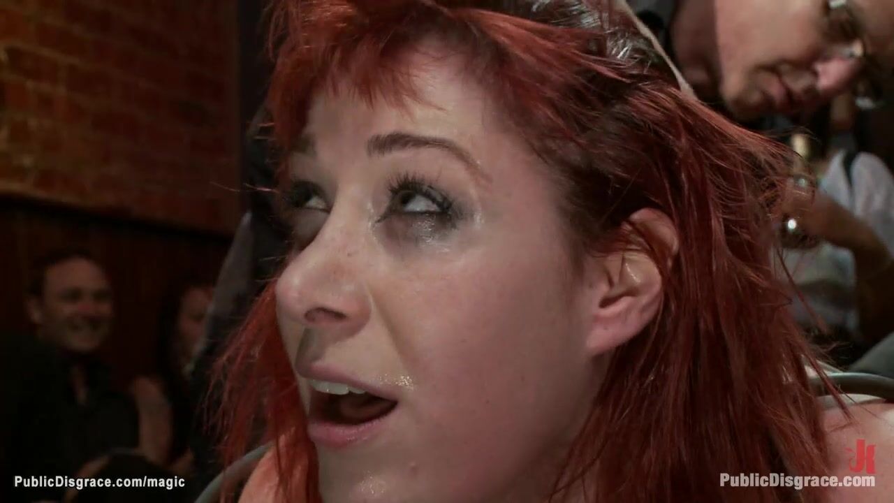 Red head slave Odile is bound in doggy style cage and pussy fingered then throat banged till anal fucked by big dick Mark Davis in crowded public bar full of strangers