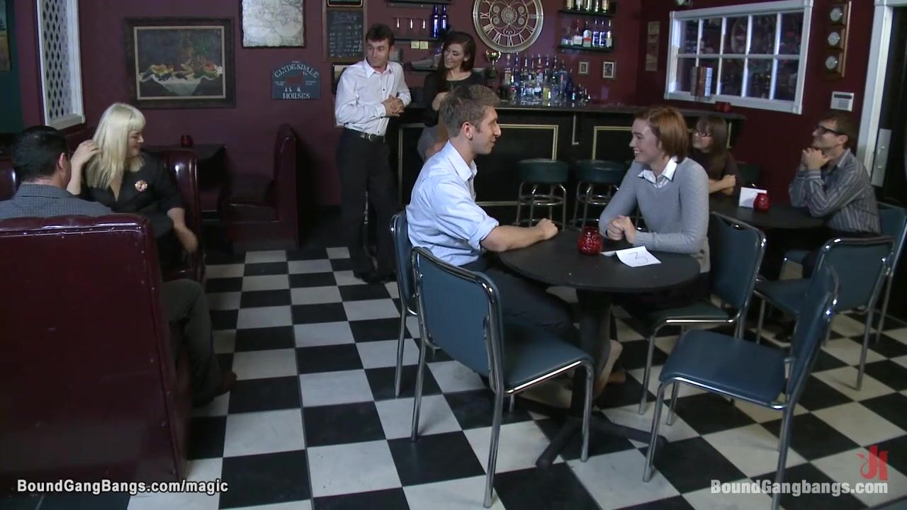 Naive brunette amateur babe Jodi Taylor after speed date is lured in hotel room by group of guys and there is bound and double penetration fucked with big cocks