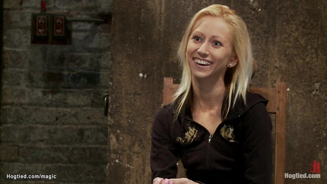 Slim blonde slave Rene Phoenix is bound in hogtie position over padded chest with hook in the ass and ball gag in mouth then pulled in the air by master Matt Williams