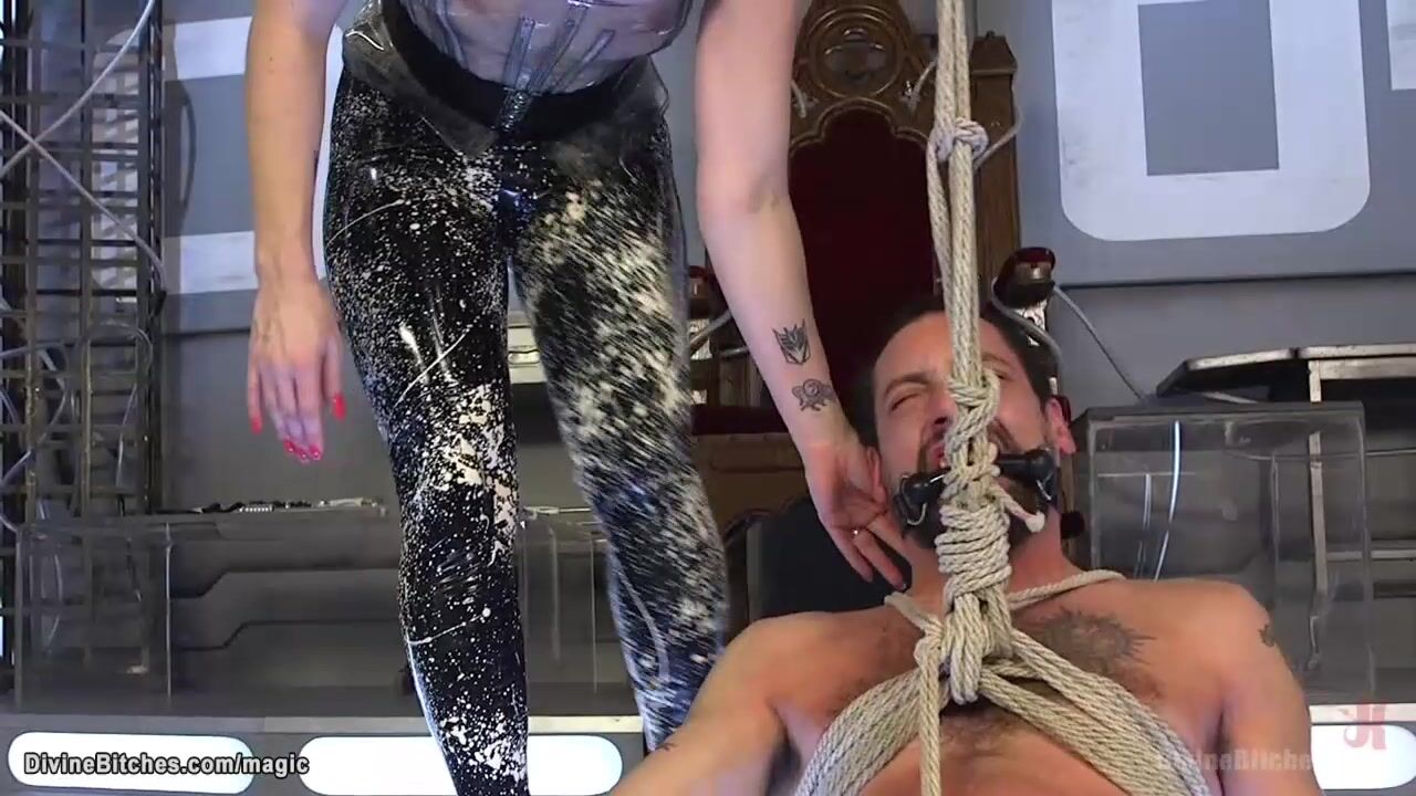 Big tits red head MILF femdom in latex Bella Rossi rides cock to gagged bound man slave DJ then with strap on cock pegs him in doggy position then rides his hard cock in scissors position