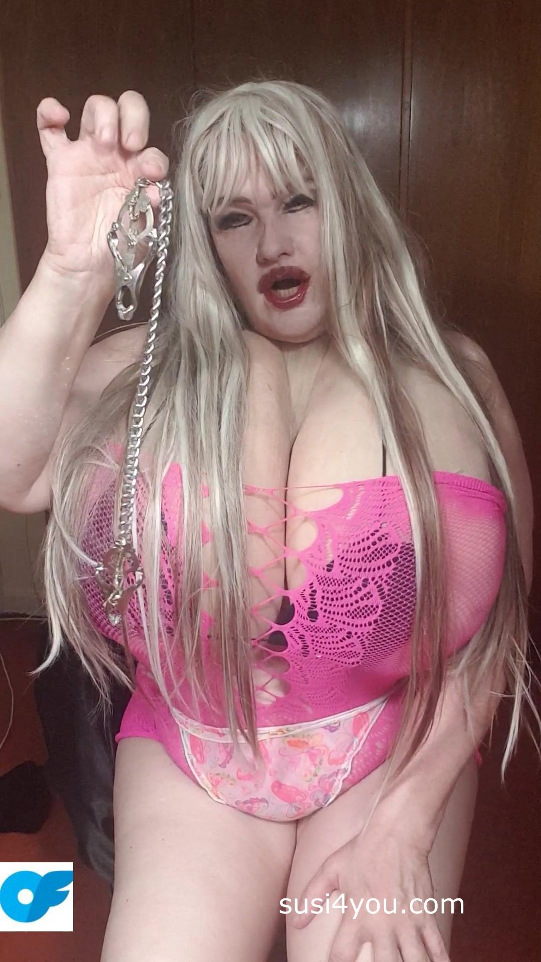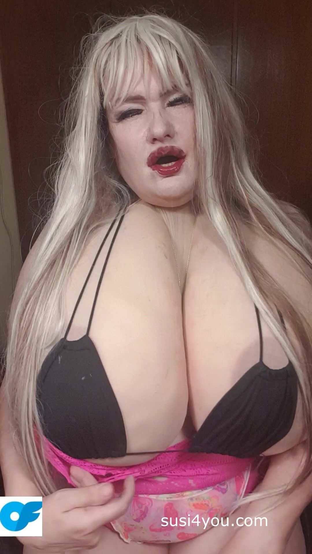 Look at Susi. She is taking her huge boobs out. She is rubbing her nipples put on nippleclambs She is teasingwith huge Cup K tits spreading her legs showing pussy