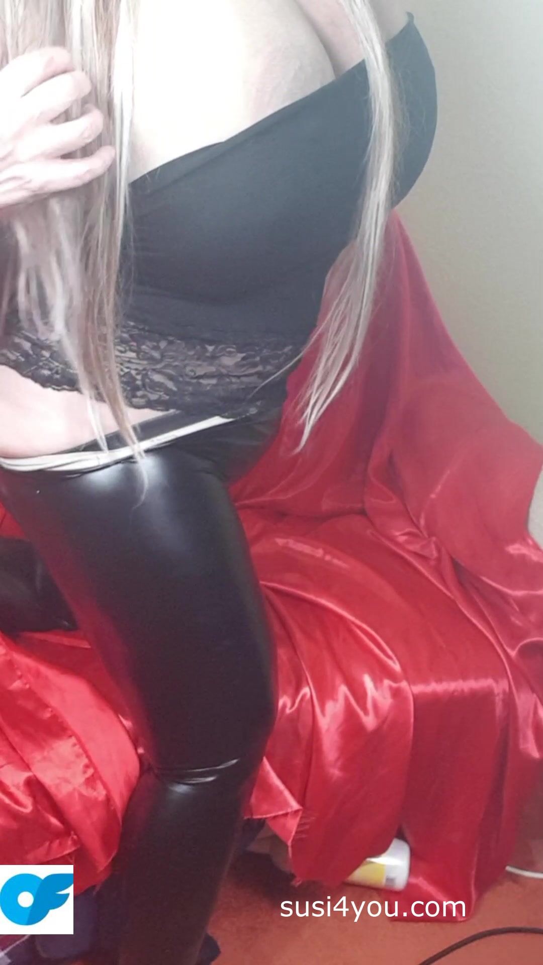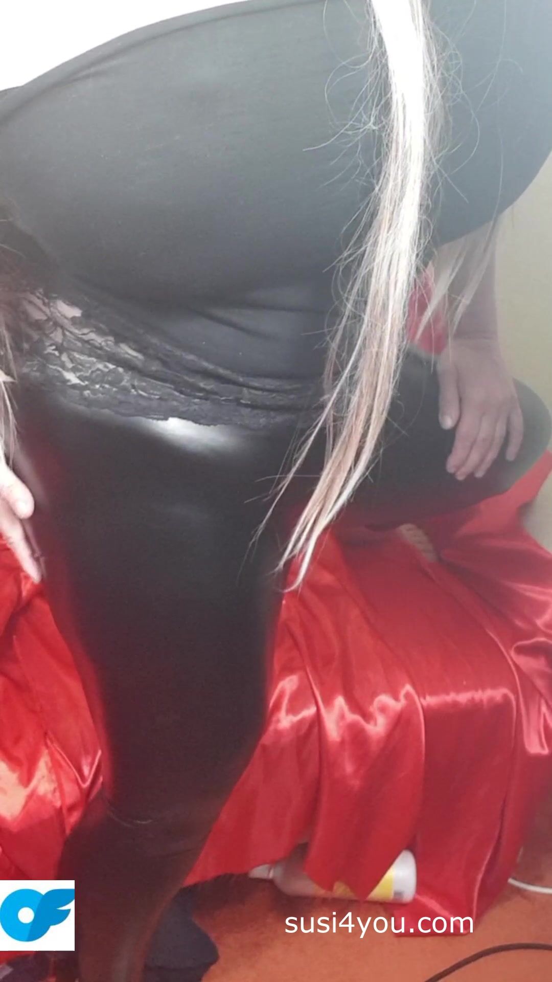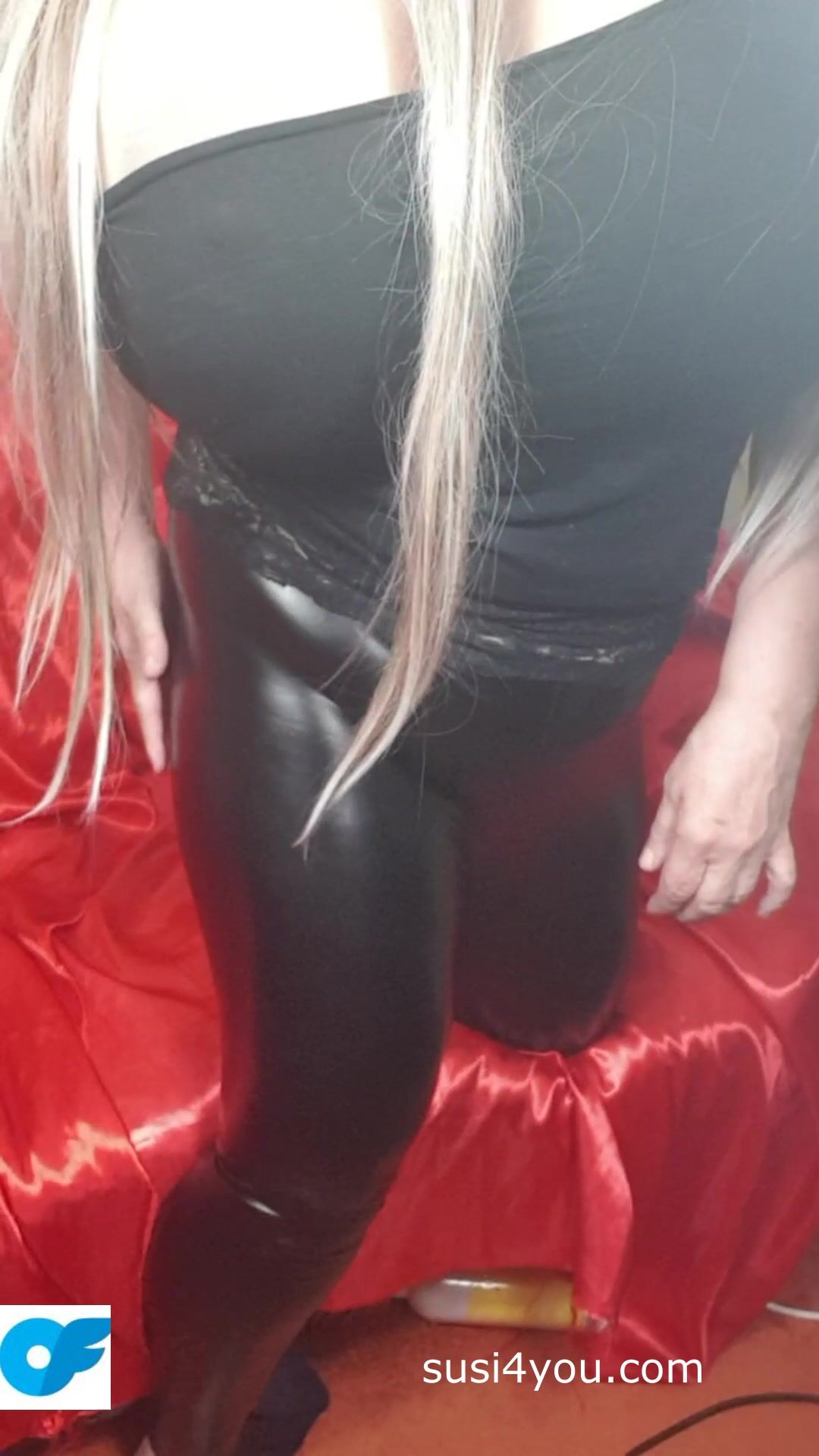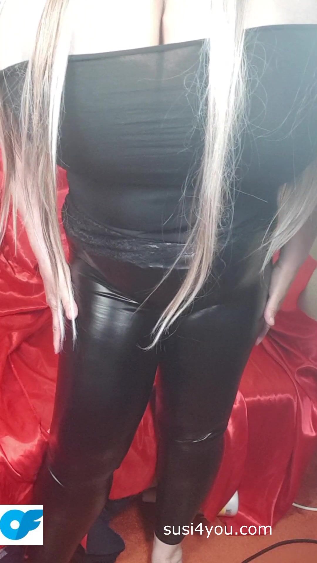 Susi is wearing black latexpants and black t shirt. She is teasing you with her fat ass. She is pulling down latex pants showing fat cup k tits. Enjoy those fat tis and big ass She is showing asshole lick it and come with her.