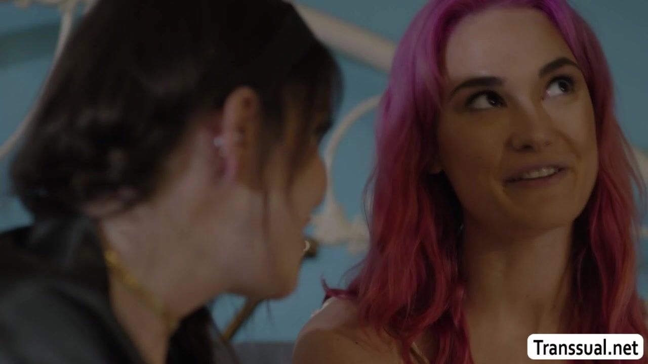 Busty ladyboy and her stepsister are on the bed talking and then they get horny and start kissing each other passionately.After that,she lets her stepsis throat her hard shecock passionately.In return,she fucks her wet pussy so deep and hard.