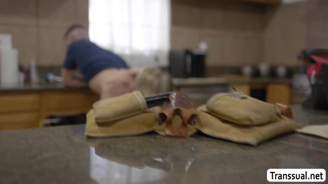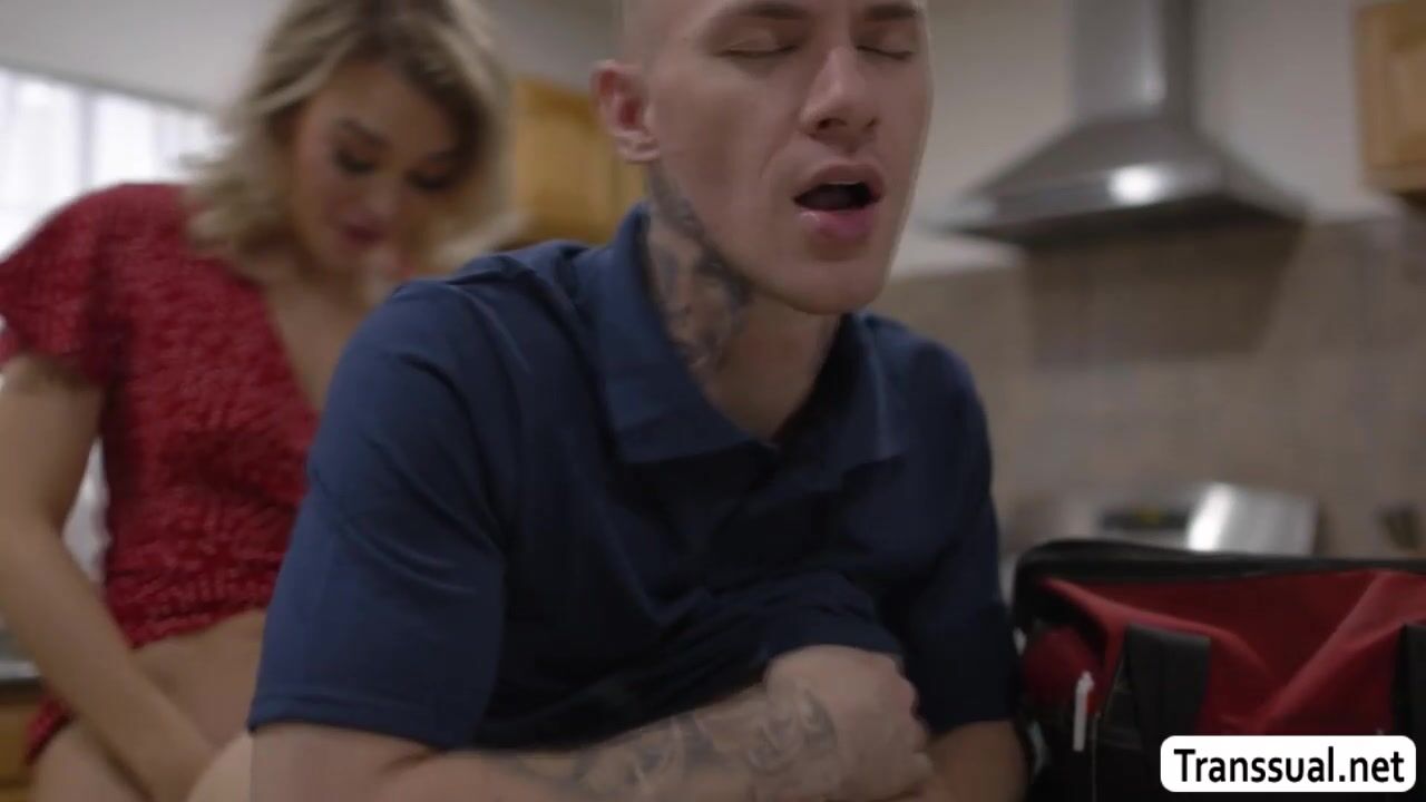 Busty TS gets horny while watching the guy fixing her pipe lines in the kitchen.She cant resist and she then licks the ass of the guy and next is,she fucks his ass so hard.After that,they move into the room and she then continue fucking his ass.