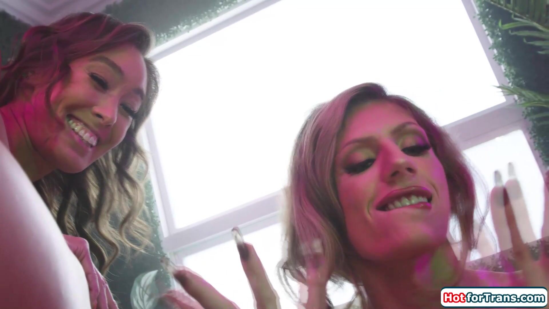 Shemale Jade Venus takes a bath while asian Christy Love masturbating and squirting.The busty tgirl invites her in the bathtub and rubs for an orgasm.The big boobs trans kisses her and is deepthroated.The tranny licks pussy and fucks her for squirt
