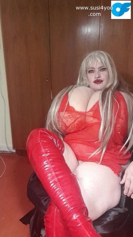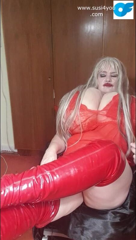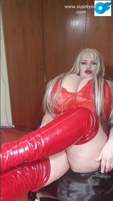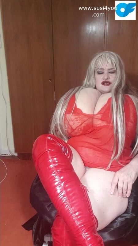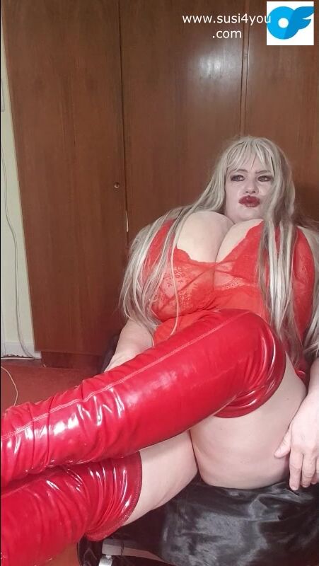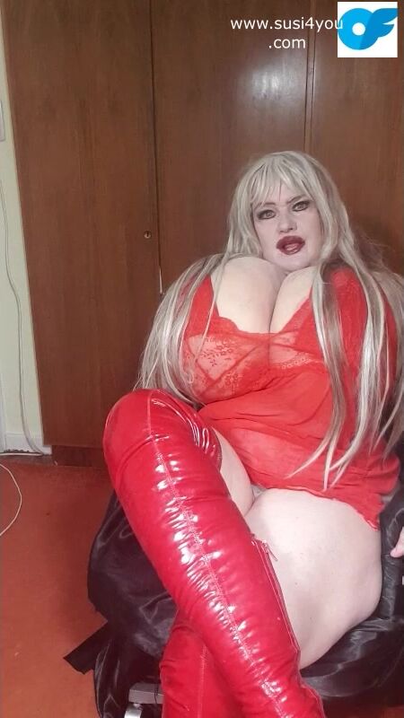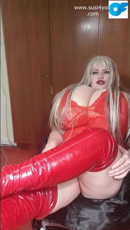 Susi wearing red fishnet red boots teasing lick my boots