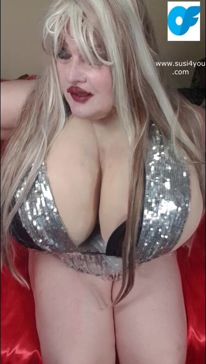 Lady with a silverscarf is on her bed Susi is taking a pink panty to stuff it in fat pussy Enjoy it and gimme all your cum She is spereading her legs showing her pussy and big tits so fat cup k size lic it suck it nasty horny boy.