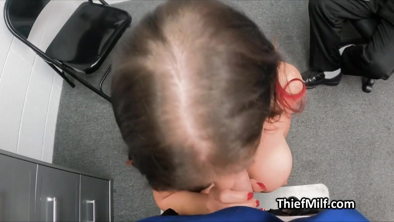 The unexpected happened. This slutty mature gets sent into the backoffice for questioning and her ex husband shows up to ride her pussy in threeway!