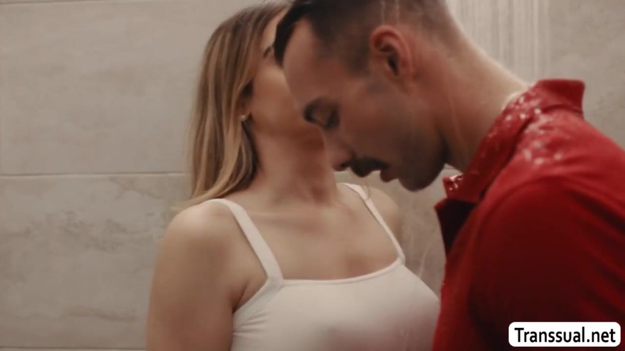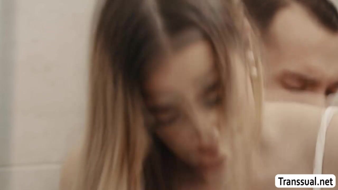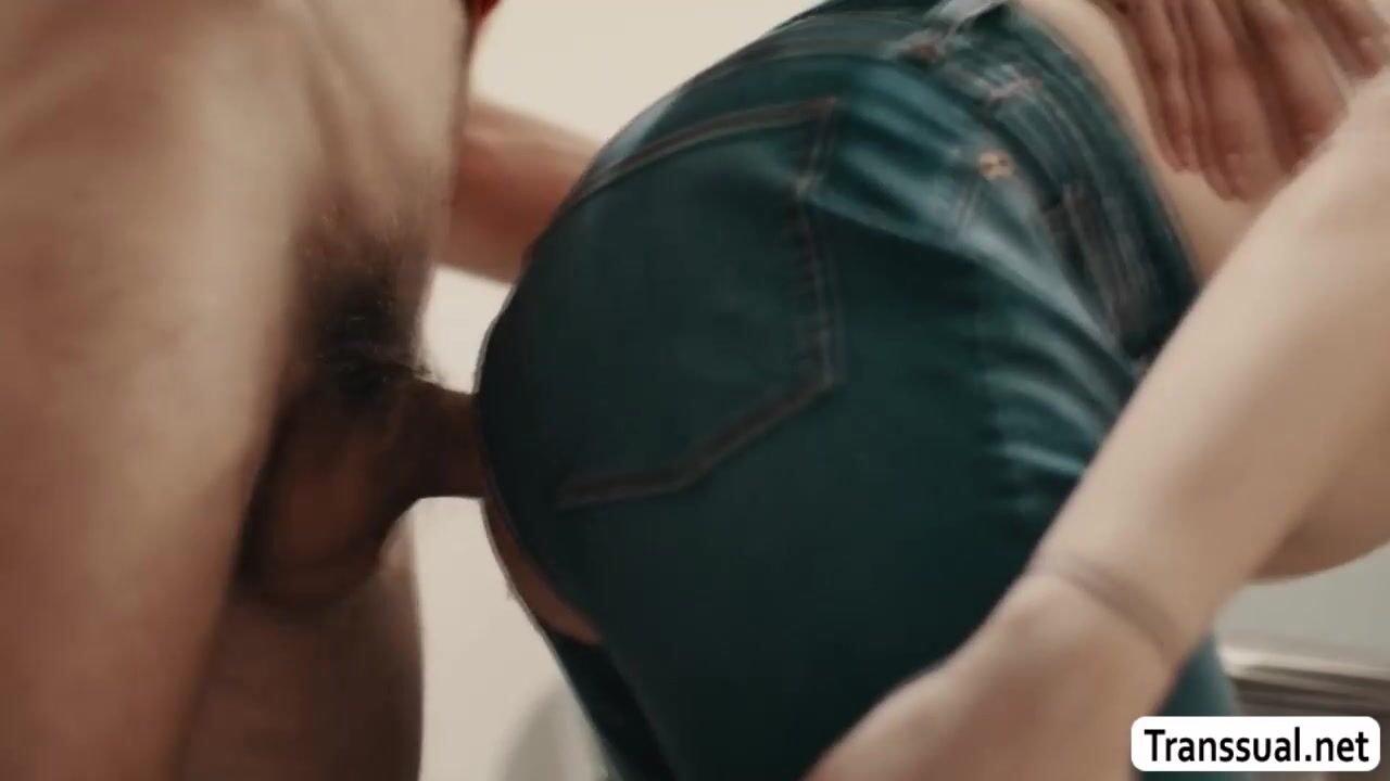 Perv guy fucks the ass of their TS babysitter while shes doing laundry.After that,they move into the bathroom and they get caught by his wife.Instead of stopping,he licks her ass first and he fucks it again.