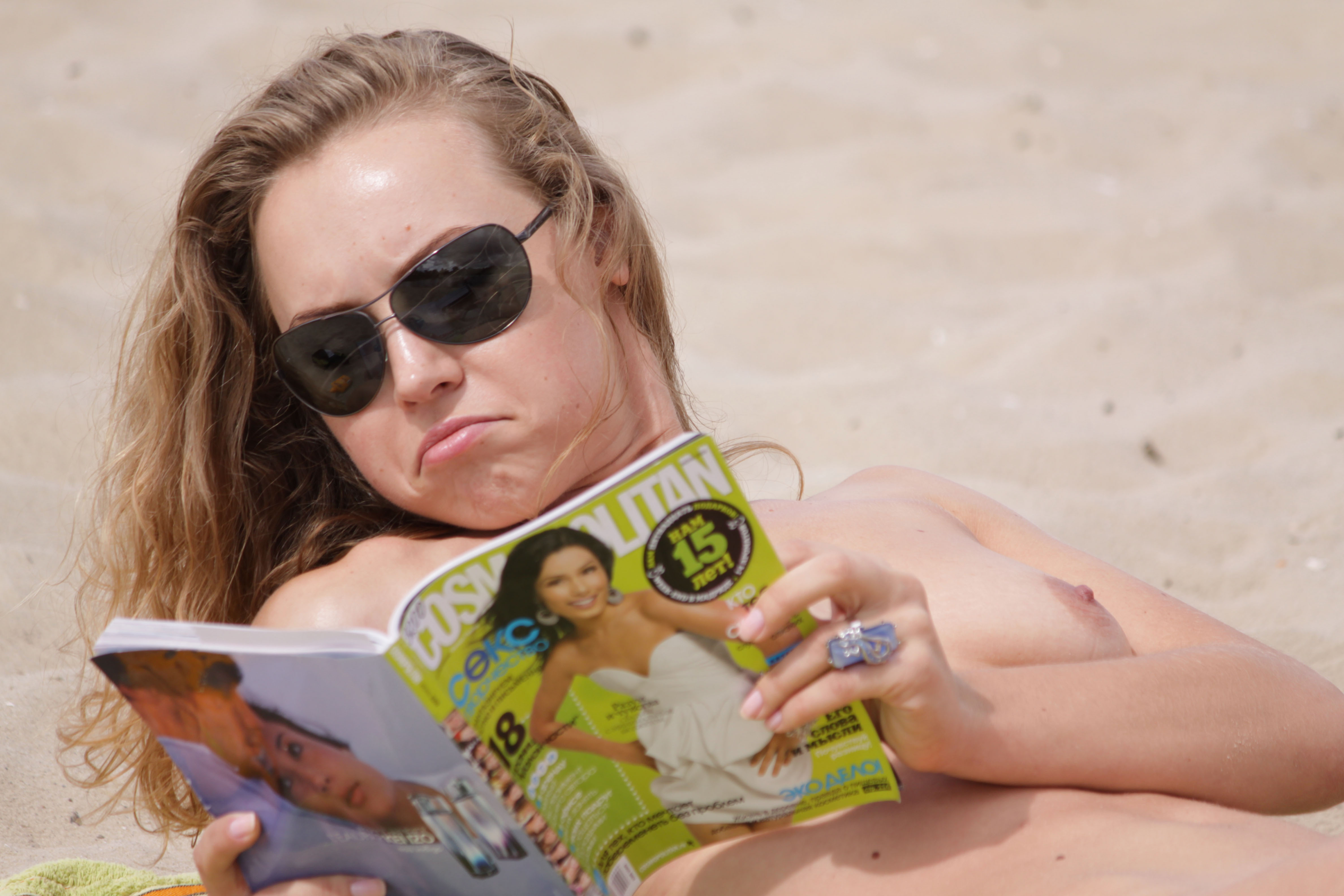 Skinny and beautiful young nudist blonde relax at the beach and tan their slim bodies